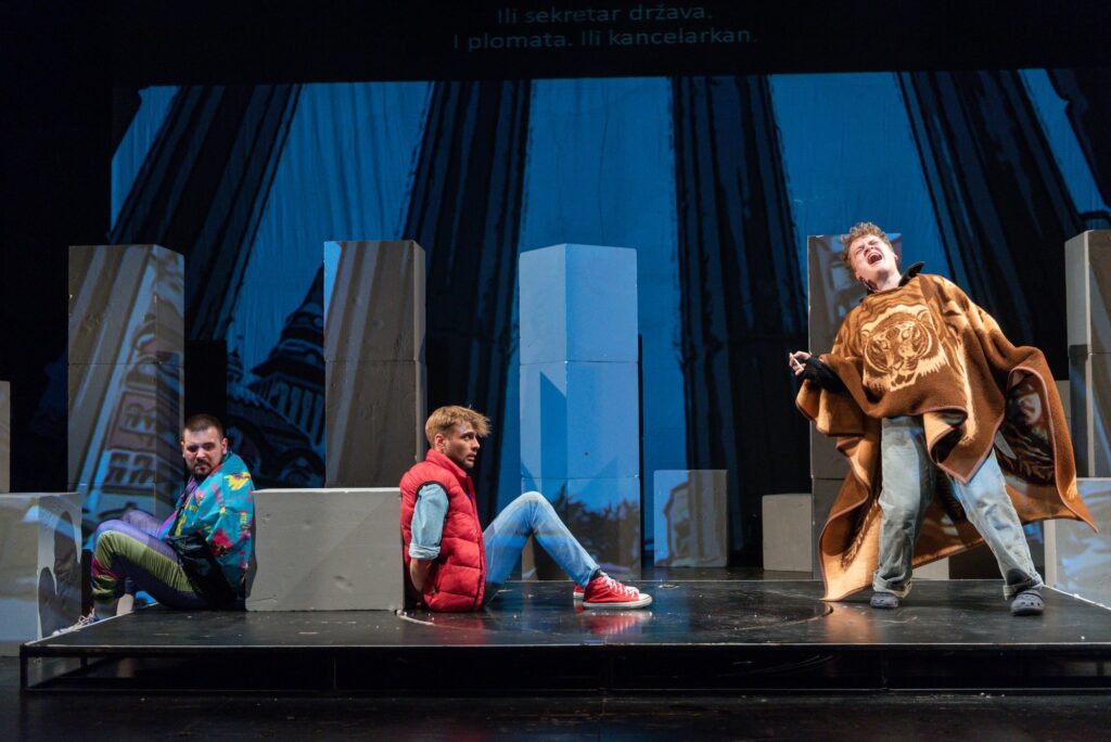 Nyári Ákos, Búbos Dávid és Ágyas Ádám a folyamatosan teltházzal futó Félelem és reszketés Szabadkán című produkcióban (Fotó: KDSZ/Molnár Edvárd)
