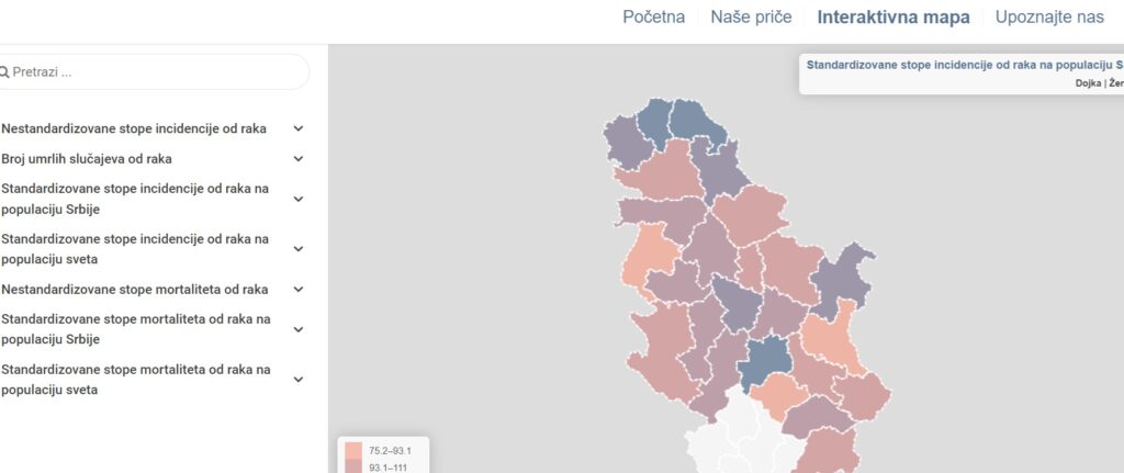 A Batut Közegészségügyi Intézet adatai szerint Észak-Bácska és Észak-Bánát azok a területek, ahol a 100 000-re jutó daganatos betegek száma a legmagasabb, és a harminc százalékuk vastagbél-, tüdő- vagy mellrákban szenved. Az észak-bácskai körzetben van a legtöbb vastagbélrákban szenvedő férfi, Észak-Bánátban viszont a nőket érinti inkább ez a betegség. A melldaganat esetében is Észak-Bácska és Észak-Bánát „vezet”, a legtöbb tüdőrákban szenvedő férfit pedig Észak-Bánátban, Szerémségben és Nyugat-Bácskában jegyezték. Észak-Bácskában a legnagyobb a tüdőrákban szenvedő nők aránya is. Az interaktív térképen pontosan látszik, hogy melyik rákos megbetegedés melyik nemet és melyik országrészt érinti a leginkább. Ennek többek között az a célja és szerepe, hogy az egészségügy célzottan tudja megszervezni a megelőző vizsgálatokat és programokat is.