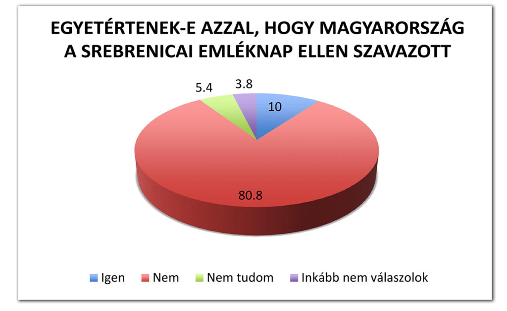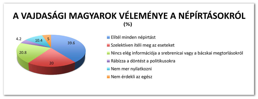 Árnyaltabb képet mutat válaszadóink viszonyulása a Srebrenicánál történtek értelmezésében. A válaszadók 39,6 százaléka minden népirtást elítél. 20,8 százalék mondta azt, hogy nincs elég információja az esetekről. 20 százalék szelektíven ítéli meg a népirtásnak minősülő eseteket. Egy kis hányaduk – 4,2 szzalék – rábízza a politikusokra a döntést. Ennél a kérdésnél mondták legnagyobb arányban – 10,4 százalék –, hogy nem mernek nyilatkozni.