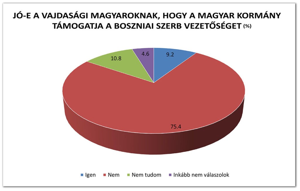 Végül arról kérdeztük önöket, jót tesz-e a vajdasági magyaroknak, hogy a magyar kormány az utóbbi időben ennyire látványosan támogatja – Szerbia és Oroszország oldalán – a szakadár boszniai szerb vezetőséget. Egyértelműen nemmel felelt 75,4 százalék. Igennel szavazott 9,2 százalék. Itt volt a legnagyobb aránya a „Nem tudom” válaszoknak: 10,8 százalék.