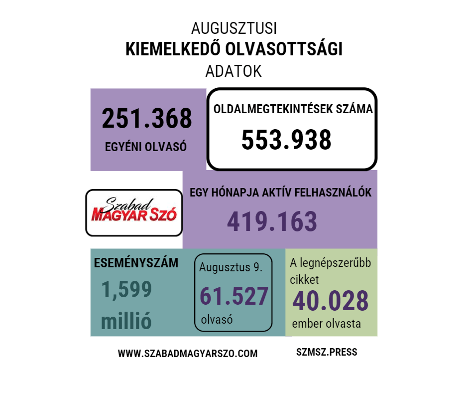 Augusztus hónapban eddig a legolvasottabb cikkünket 40 028 olvasó nyitotta meg, a Szabad Magyar Szó címoldalát pedig eddig 31 576-an látogatták meg.