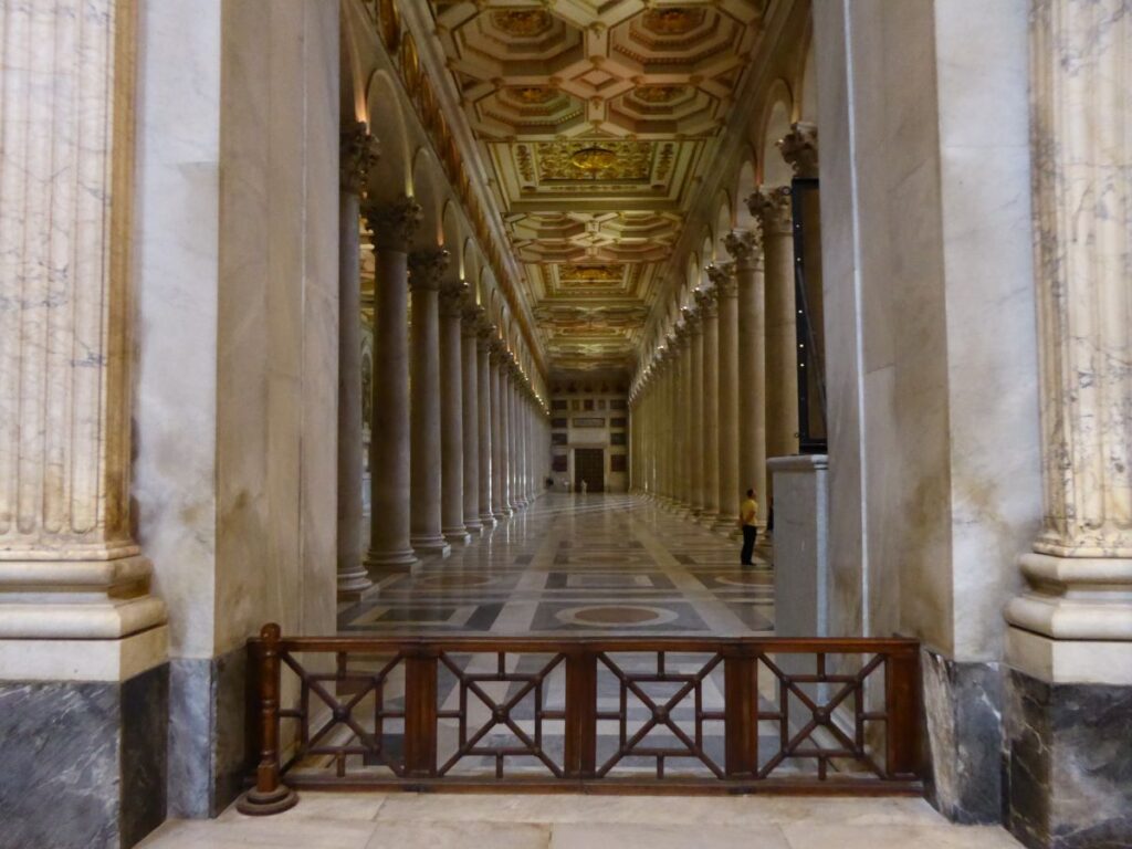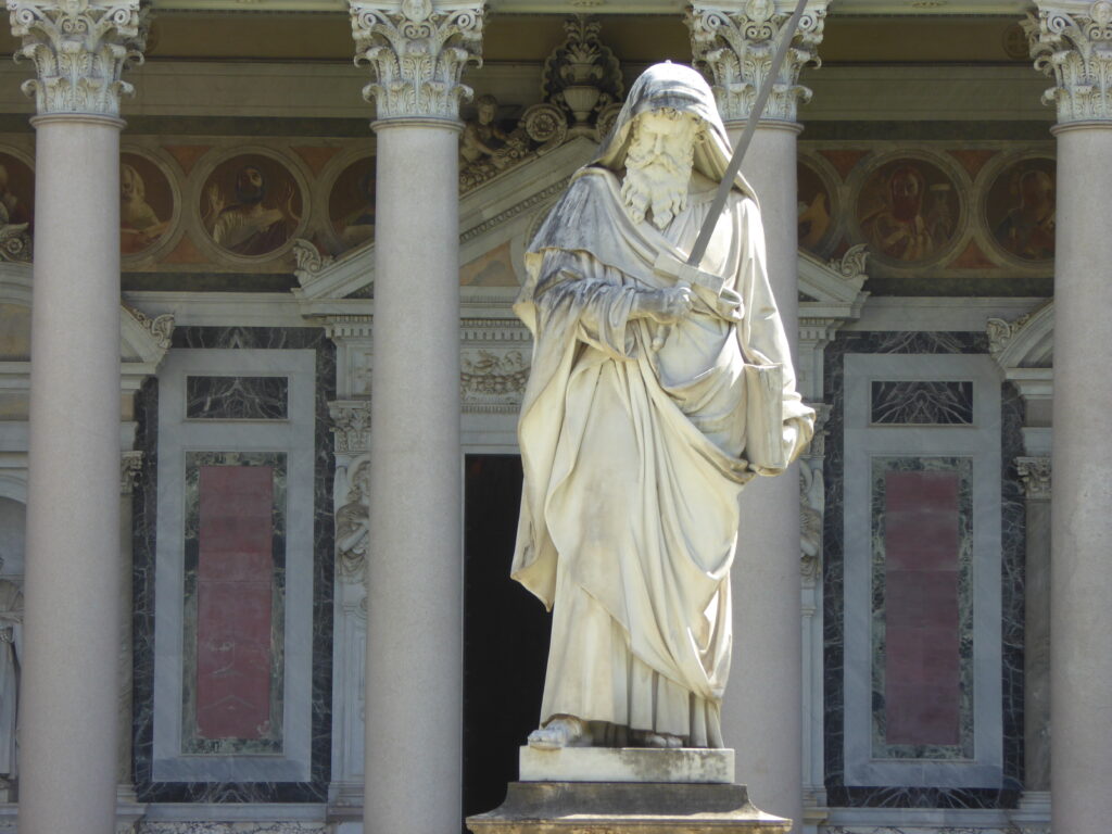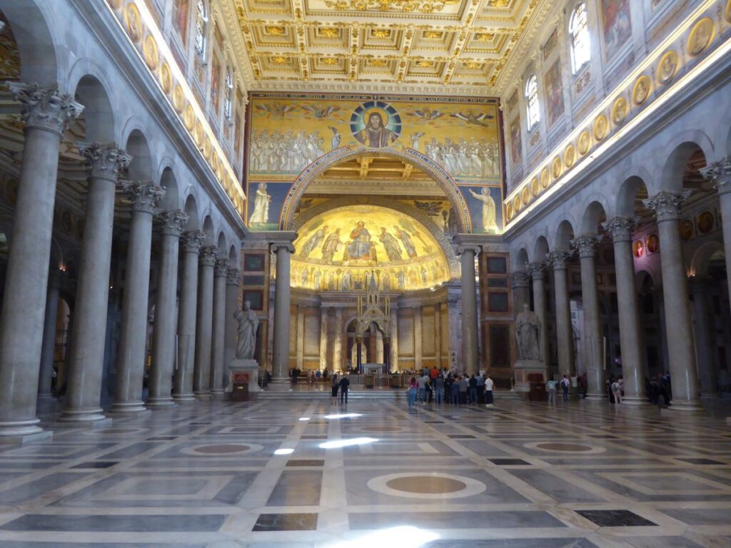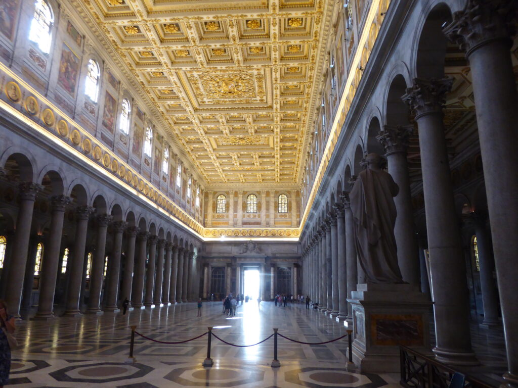 Másnap, mivel nem fűlik a fogam a turistákkal való közelharcra, a város központi nevezetességeit a központba sűrítő eszme helyett egy olyan bazilikát választok ki, amit korábbi római tartózkodásunk alatt elmulasztottunk megnézni, ez pedig a San Paolo fuori le Mura bazilika, magyarul a „Falakon kívüli” Szent Pál-bazilika, Róma második legnagyobb bazilikája, ahova a hagyomány szerint Pál apostolt eltemették. Később követői egy emlékhelyet emeltek a sírja fölé, amelyet cella memoriae-nak neveztek. Constantinus császár itt építtetett egy bazilikát. VIII. János pápa megerősítette a bazilika és a kolostor falait, válaszul a szaracén betörésekre. Amit ma láthatunk, az a 1823. július 15-ről 16-ra virradó éjjel kiütött tűz utáni, XII. Leó által elkezdtett újáépíttetés eredményeként látható bazilika.