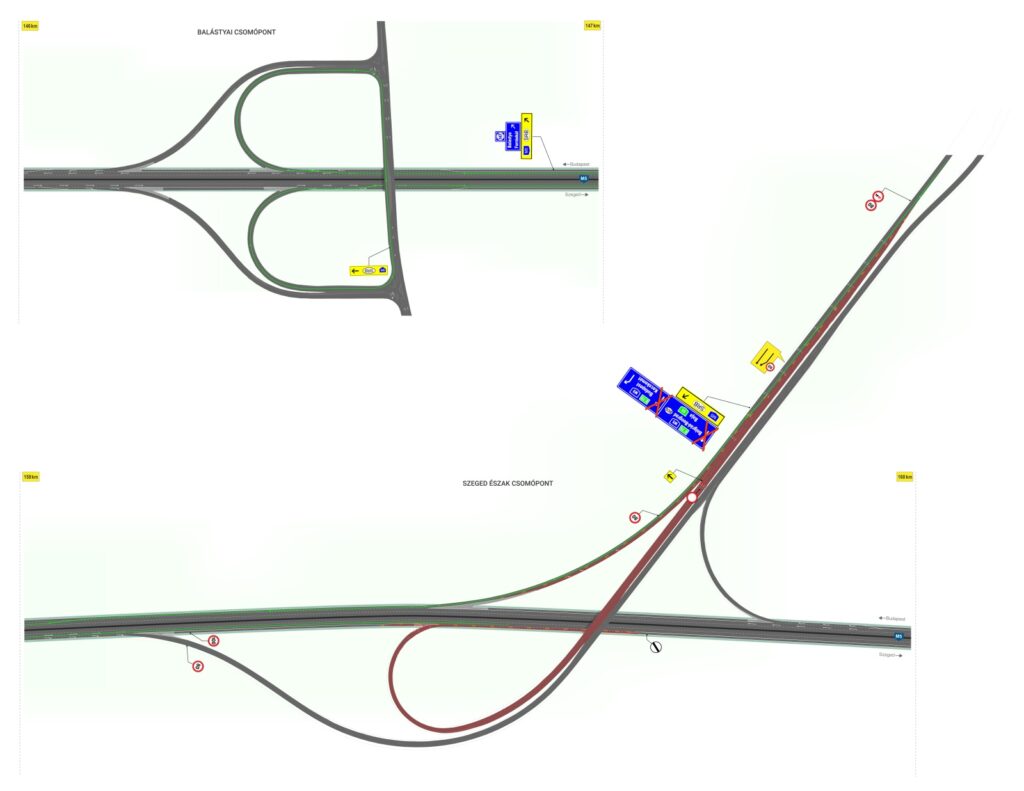 Lezárják az M5-ös autópálya Szeged észak csomópontja szeptember 20-tól október 11-ig a határállomás felé vezető oldalon – írja az AKA Zrt. Az útlezárás a 159-es kilométernél található lehajtót érinti, melyet a közlekedési munkálatok miatt ideiglenesen lezárnak. A gépjárművek számára a Balástyai csomópontnál biztosítanak kerülőutat, és a forgalmat erre terelik. Az elkerülő útvonalakon sebességkorlátozások lesznek érvényben, a maximális sebességet 100 km/órában határozzák meg.