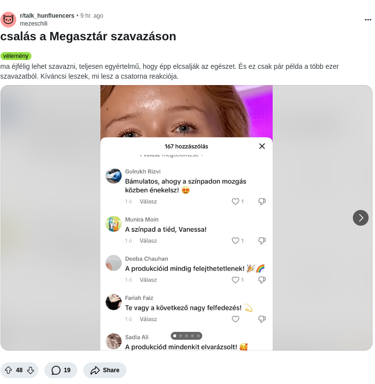 A Bors online cikke azonban tisztázza, hogy a Moisiak Vanessa bejegyzései alatti lájkokkal van a baj, a kommentelők fotókat is gyűjtöttek bizonyítékként, ahol jól látható, hogy szinte megszámlálhatatlan mennyiségű külföldi profilról kedvelik a fiatal lány videóját és írnak magyarul hozzászólásokat, ami csak még gyanúsabbá teszi a helyzetet.