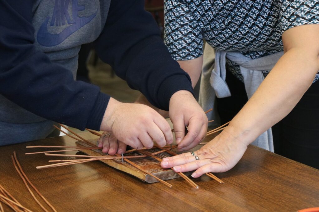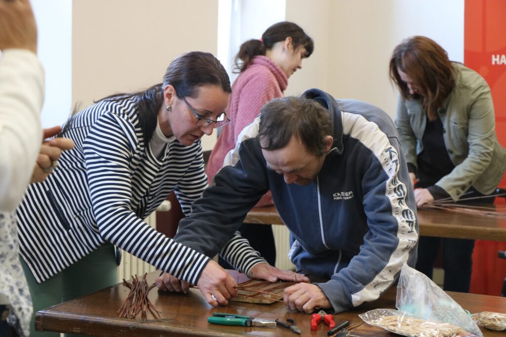 A szervezők kétnapos foglalkozásban gondolkodtak. Az első napra – jelentkezés alapján – kézművesek vártak, de gyógypedagógus, virágkötő és tánctanár is volt az érkezők között. Közös volt bennük, hogy a témát szívükön viselik, s a folytatásban is részt vesznek. A délelőtt Legeza Márta elméleti előadása hangzott el, amin szóba kerültek a már említett pályázat eredményei is. Az ezt követő gyakorlati foglalkozáson a résztvevők a másnapi, fogyatékkal élőkkel való foglalkozásra készültek mondókákkal, rávezető játékokkal, s megismerték az eszköztár kiválasztásának módszertani szempontjait is. A mentorok – adventhez közeledve, a kosárfonást fókuszba helyezve – karácsonyi csillagot készítettek, ezt követően az adai fazekasmester segítségével az agyagmegmunkálás fogásaival is ismerkedtek.