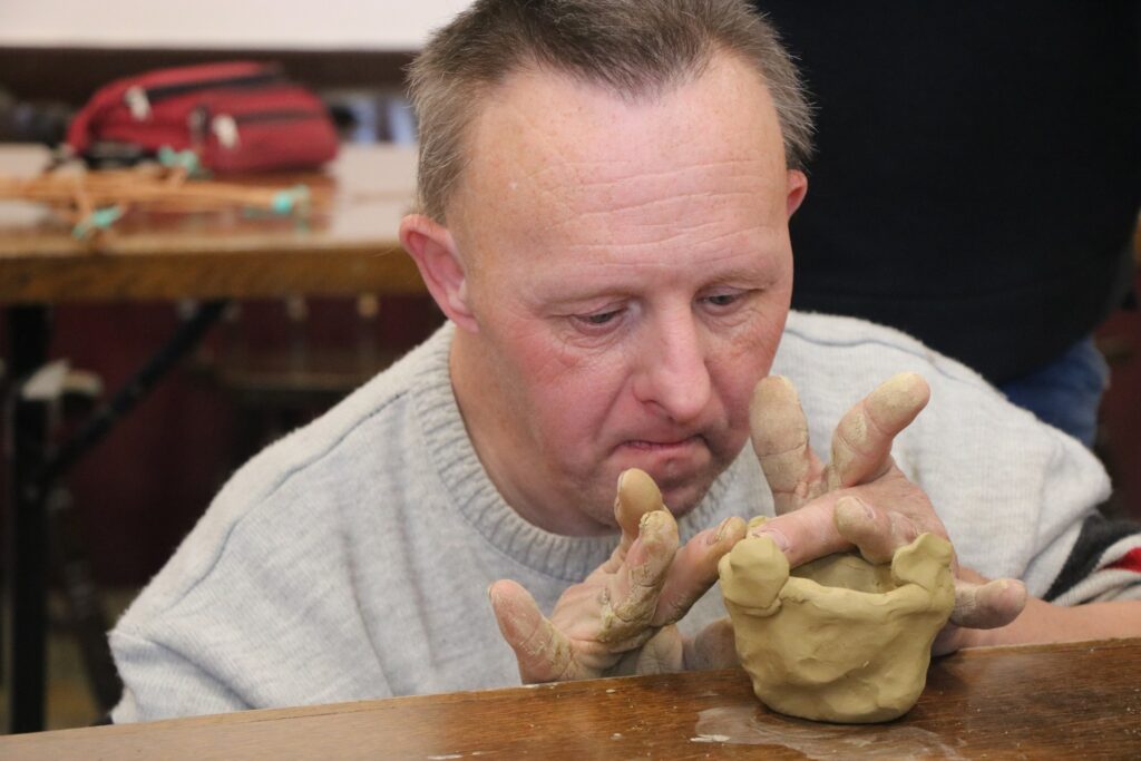 Másnap a zentai „Kéz a kézben” Értelmi Fogyatékosok és Segítőik Civil Szervezettől érkezett fogyatékosok párba álltak egyenként az előző nap gyakorlatot szerzett mentorokkal. A karácsonyi csillag után kisebb agyagtárgyakat is készítettek közösen.
