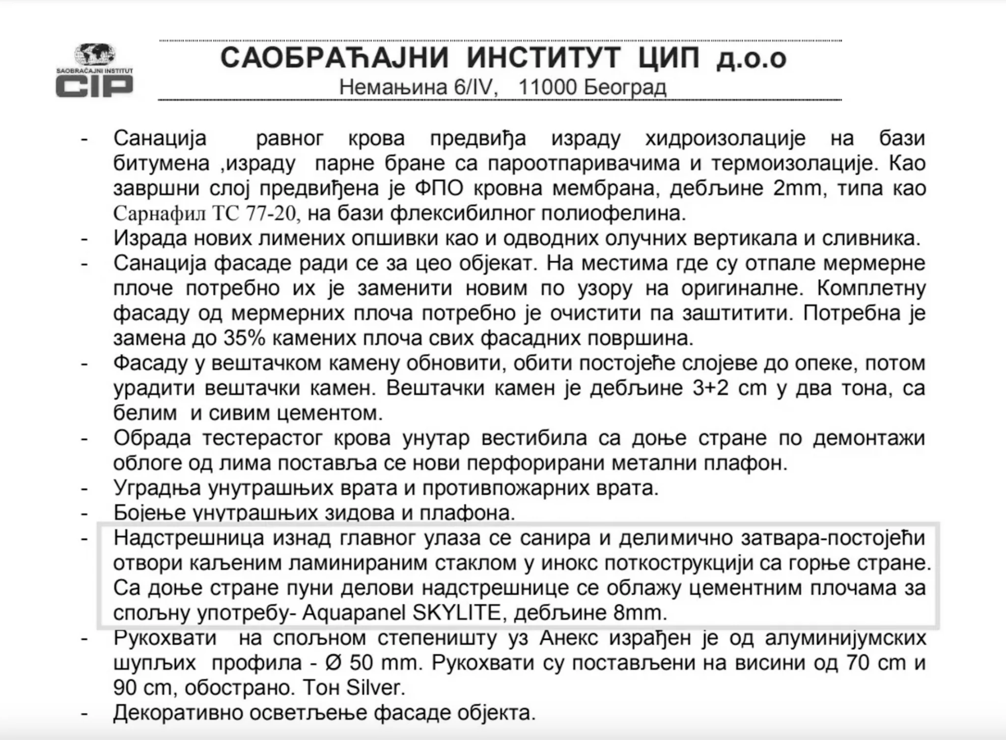 Közvetlenül a november elsején történt baleset után, amelyben 14 ember életét vesztett, hárman pedig életveszélyes sérüléseket szenvedtek, a CIP igazgatója azt állította, hogy az előtető nem képezte a felújítás részét. Az új dokumentumok birtokában a Nova ekonomija kérdéseket intézett az intézethez, de választ nem kapott, és a telefonos megkeresésükre sem reagáltak.