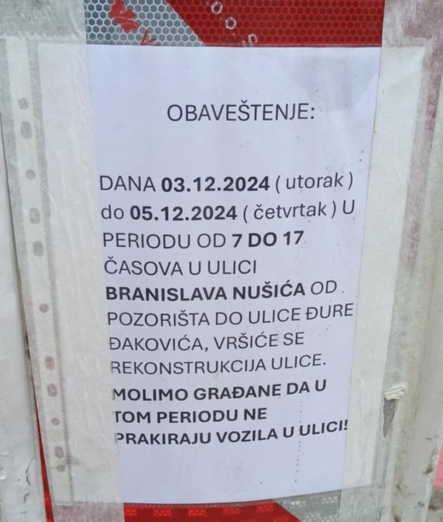 Közelebb érve azonban nem hittünk a szemünknek. A táblán ugyanis rajtahagytak egy korábbi értesítést, így csak annyit sikerült megtudnunk, hogy december elején két napra is lezárták a Népszínház mögötti Branislav Nušić utcát, s arra kérték az ott lakókat, és a polgárokat, hogy ebben az időszakban ne parkoljanak ott, mert újraaszfaltozzák azt a szakaszt.