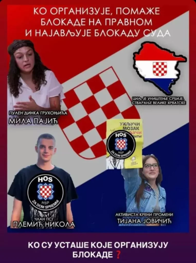 Kik azok az usztasák, akik a blokádokat szervezik? – tette fel a kérdést egy a közösségi hálón közzétett fotómontázson Predrag Terzić, Kraljevo haladópárti polgármestere. A képen három egyetemista: Mila Pajić, Tijana Jovičić és Nikola Plemić látható. A „szerző”, azaz a polgármester szerint az ő céljuk Szerbia megsemmisítése és Nagy-Horvátország létrehozása.