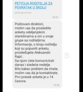 Csupán látszat az, hogy „Szerbia aggódó szülei” indítottak petíciót azzal a követeléssel, hogy gyermekeik hétfőn mehessenek iskolába, ugyanis az aláírandó petíció szövegét az óbecsei iskolaigazgatók a közös viber-csoportban kapták meg vasárnap délelőtt azzal a feladattal: továbbítsák azokat az osztályfőnököknek, ők pedig a szülőknek.