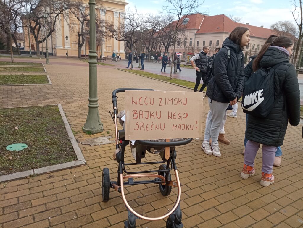 A tömeg ezt követően a községháza elé vonult, ahol sípolt és skandált, majd az úton sétálva megkerült egy negyedet, végül a 15 perces csendes megemlékezés idejére lezárták a Danilo Kiš utca kereszteződését a Fő, illetve a Zöldfás utcával.