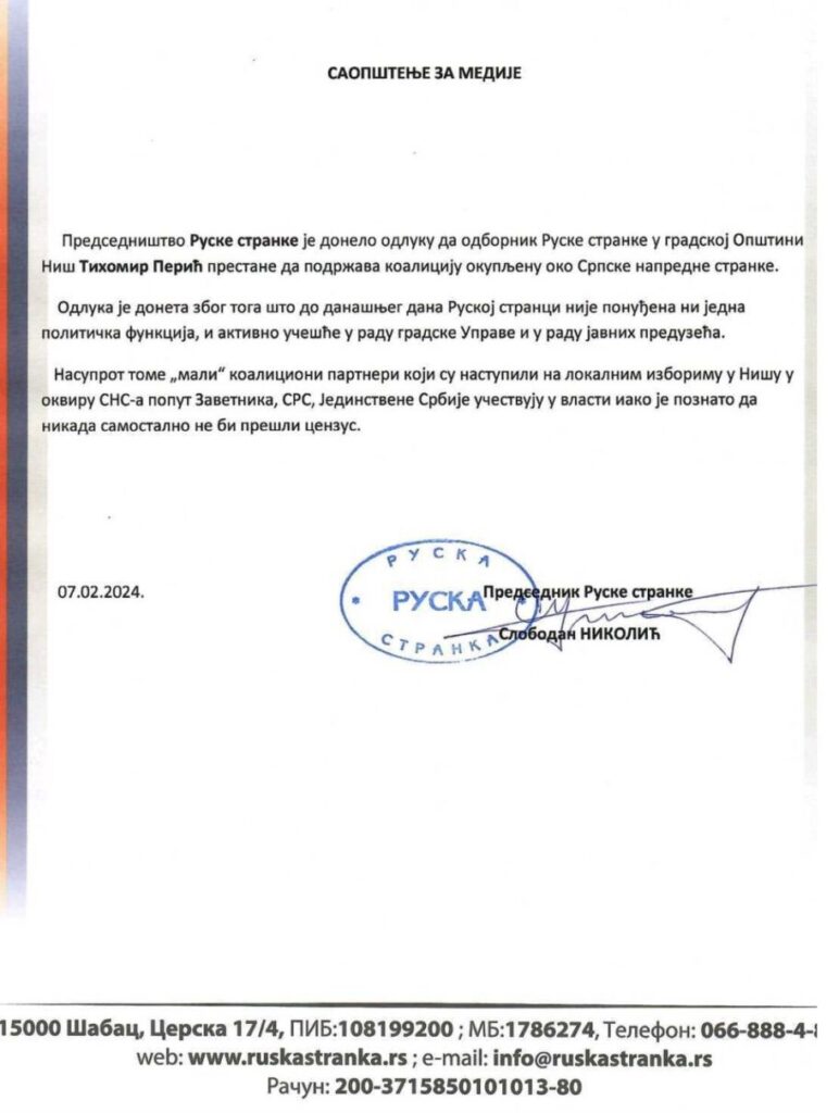 Az Orosz Párt sajtóközleményében, amelyet Slobodan Nikolić pártelnök írt alá, az olvasható, hogy a pártban döntés született, hogy Tihomir Perić ne támogassa tovább a Szerb Haladó Párt körül kialakított hatalmi koalíciót.