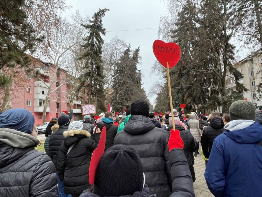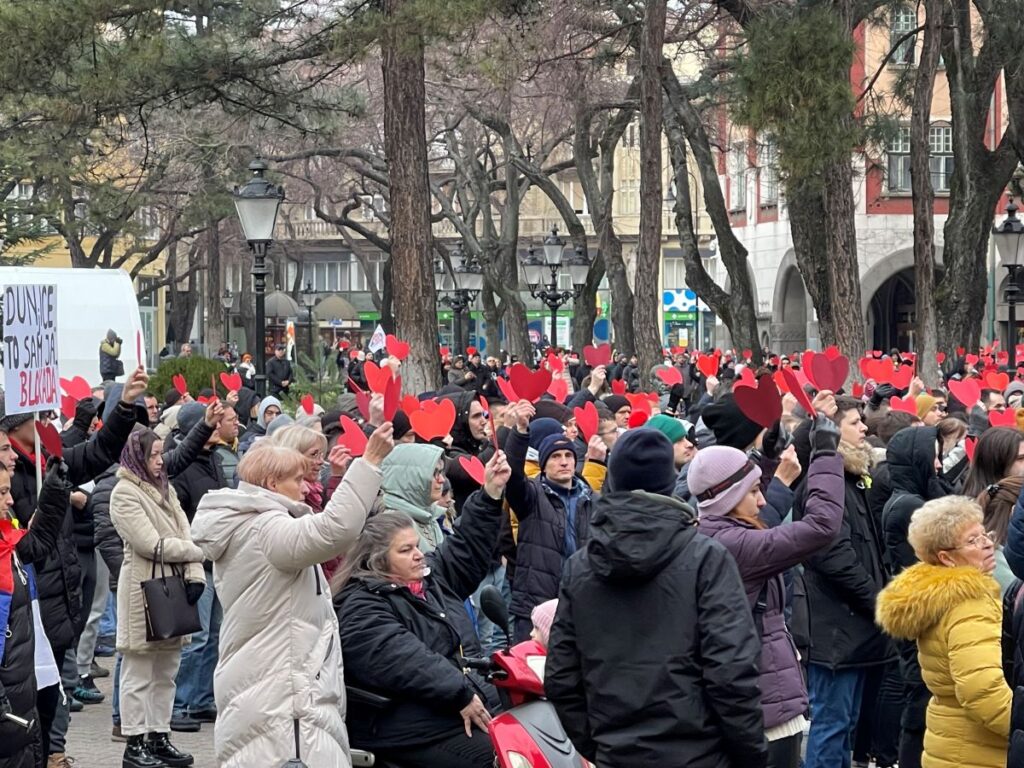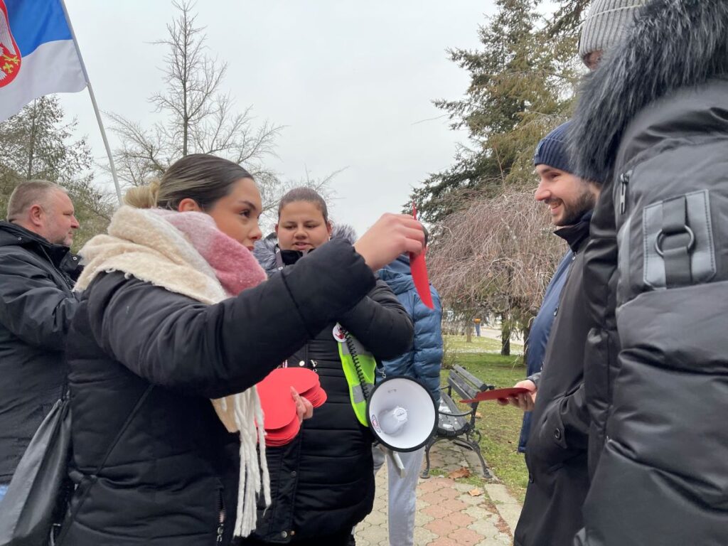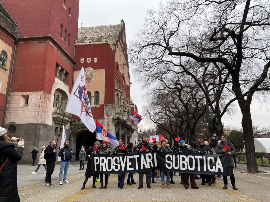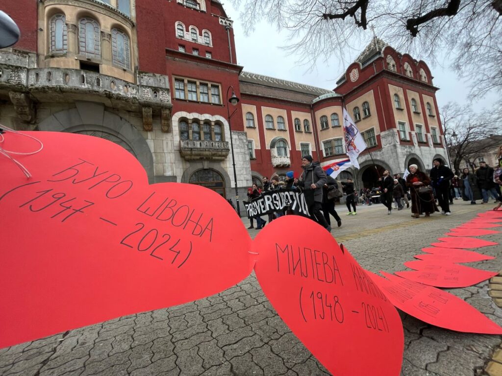 Piros papírszíveket osztogattak az egyetemisták a vasárnapi szabadkai tüntetés részvevőinek. Az elmúlt néhány héttől eltérően most nem a Harcosok sorakozója lakótelepen, hanem a Sportcsarnoknál gyülekezett az egyetemi hallgatókat támogató tömeg és a város központjáig tettek sétát, ahol a városháza előtt meleg teával várták őket önkéntesek. A városháza Strossmayer utcai végén egy traktor pótkocsijáról hangzottak el a beszédek, erre az időre a traktorok lezárták a Strossmayer utcát, a forgalmat pedig rendőrök irányították. A 15 perces csend idején a részvevők a piros szíveket emelték a magasba, nagy papírszíveken pedig az újvidéki áldozatok nevei szerepeltek a városháza épülete előtt. A tüntetés végén fekete vászonra piros festékkel kézlenyomatokat hagyhattak a tüntetés részvevői, ezt a vásznat végül a városháza bejáratára feszítették ki.