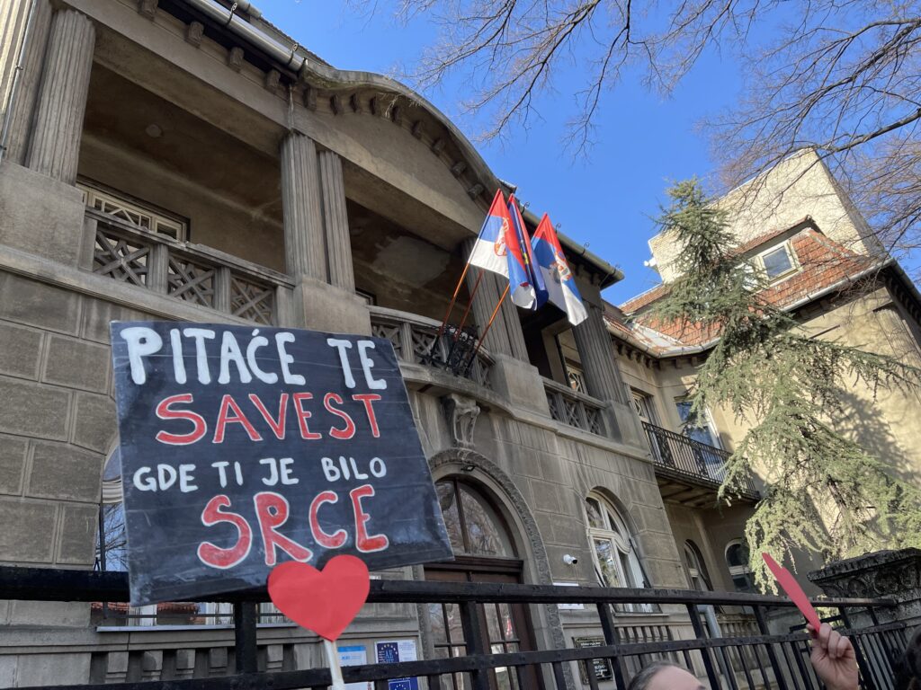 Azt követően a Sonja Marinković, az Ivan Milutinović, a Matko Vuković és az Ivan Goran Kovačić Általános Iskolák elé mennek. Ezek előtt nem fognak zajongani, hogy ne ijesszék meg a diákokat, hanem beszédeket tartanak majd, és piros szíveket feltartva énekelni fognak. Nem hivatalos értesüléseink szerint viszont ezekben az iskolákban az igazgatók rendelete alapján ma mindenki a délelőtt váltásban ment iskolába, s legfeljebb öt órájuk lesz, hogy mire a tüntetők odaérnek az intézményhez, senki se legyen a diákok közül az iskolában.
