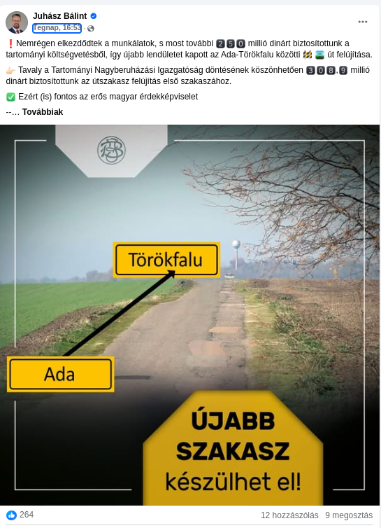 A Vajdasági Magyarok Demokratikus Közössége adai szervezete felhívja a közvélemény figyelmét, hogy Juhász Bálint, a tartományi képviselőház elnöke és a Vajdasági Magyar Szövetség tisztségviselője téves információt közölt a közösségi médiában, amikor azt állította, hogy megkezdődtek a munkálatok Ada és Törökfalu közötti úton, és hogy a VMSZ közbenjárásának köszönhetően jelentős összegek érkeztek Adára e célra, írja szerkesztőségünkhöz eljuttatott közleményében a VMDK.