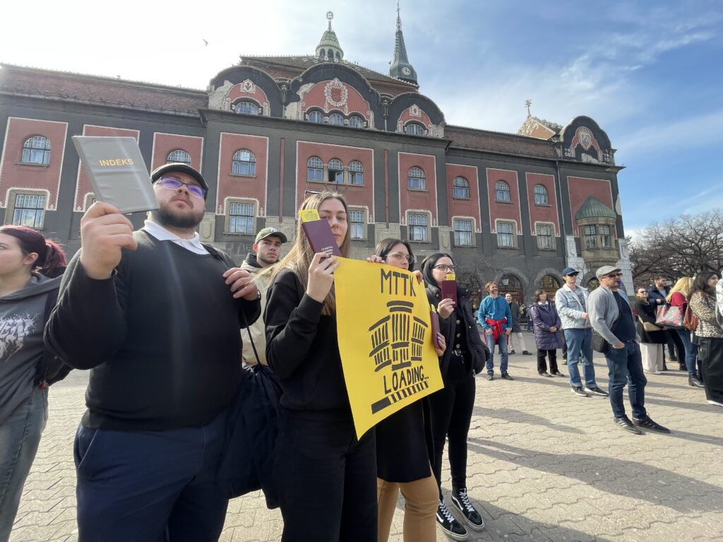 A tüntetés középpontjában, legalábbis a vajdasági magyar egyetemi hallgatók és a vajdasági magyarok számára mindenképp a Magyar Tannyelvű Tanítóképző Kar hallgatói álltak. Míg néhány héttel ezelőtt arról írtunk, hogy egyetlen egy diák jár következetesen a tüntetésekre MTTK-s felirattal, a mai megmozduláson már nagy transzparenssel álltak: MTTK loading, vagyis töltés alatt felirattal, összesen heten.