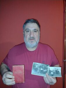 Polman Mihalj a nagyapja fényképeivel és a Titótól kapott kitüntetésével