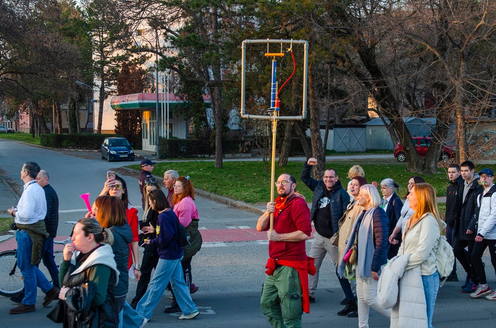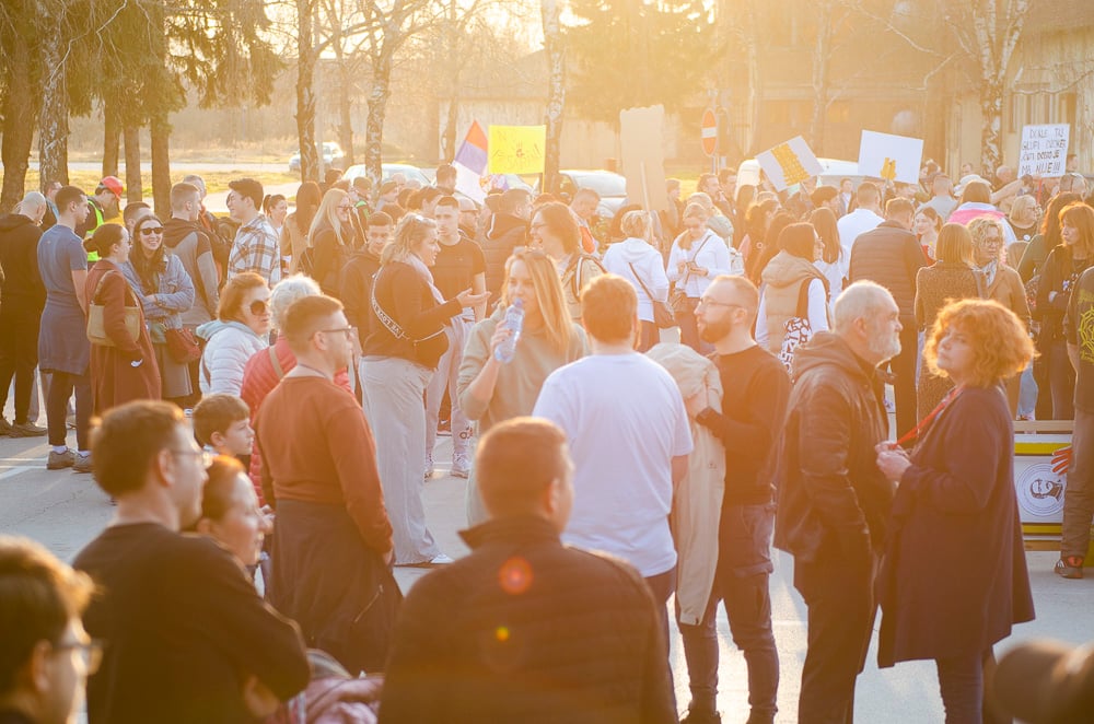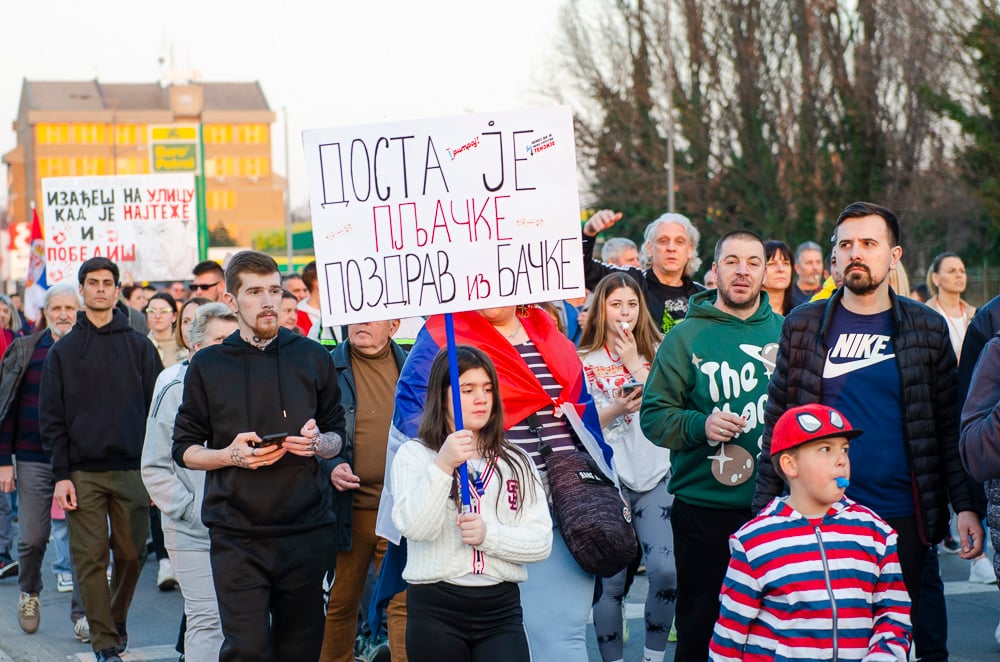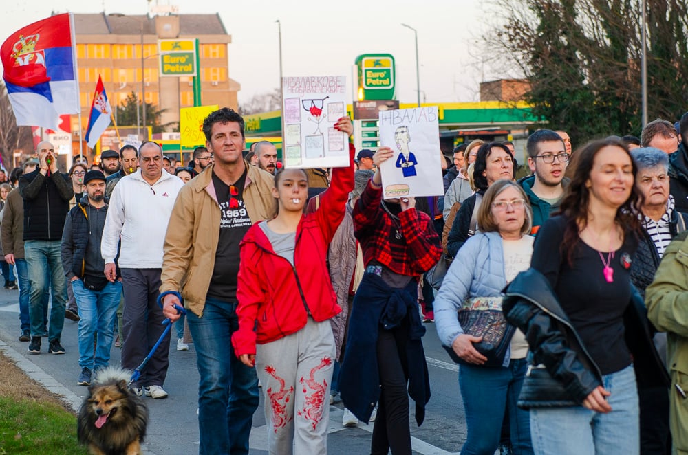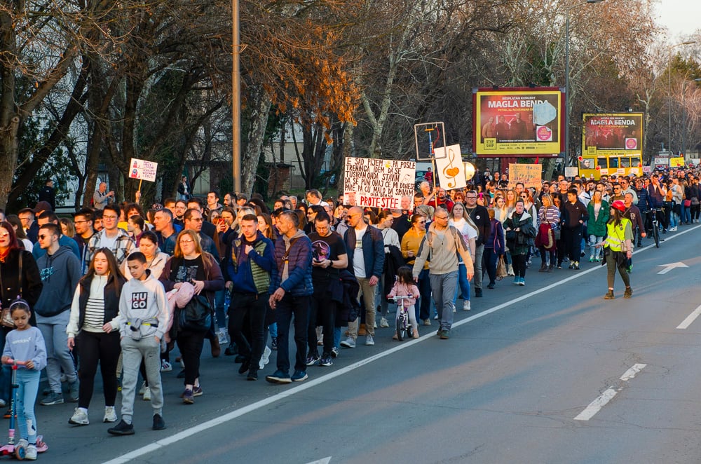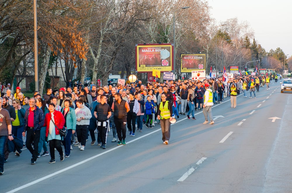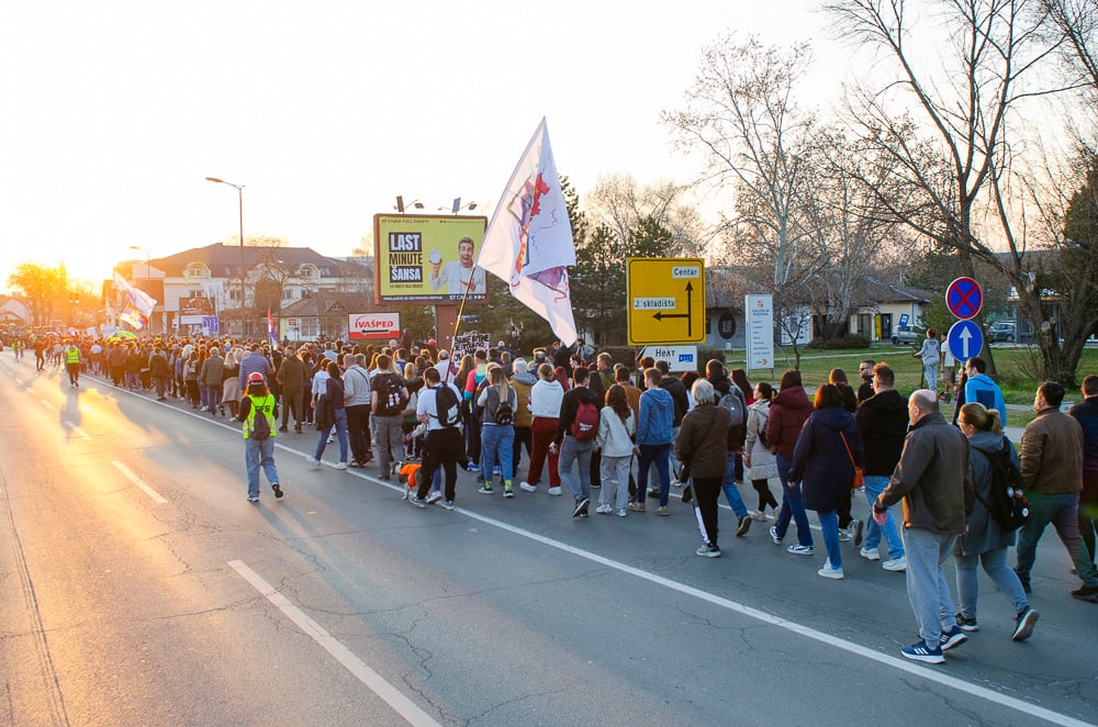 Nagy tapsot kaptak azok a fiatalok, akik március 8-án, szombaton gyalog indultak Belgrádba és vasárnap este a szabadkai tüntetéssel egyidőben Szenttamásra értek. Az egyetemi hallgató felszólította a szabadkaiakat, hogy március 15-én csatlakozzanak hozzájuk a belgrádi tüntetésen.