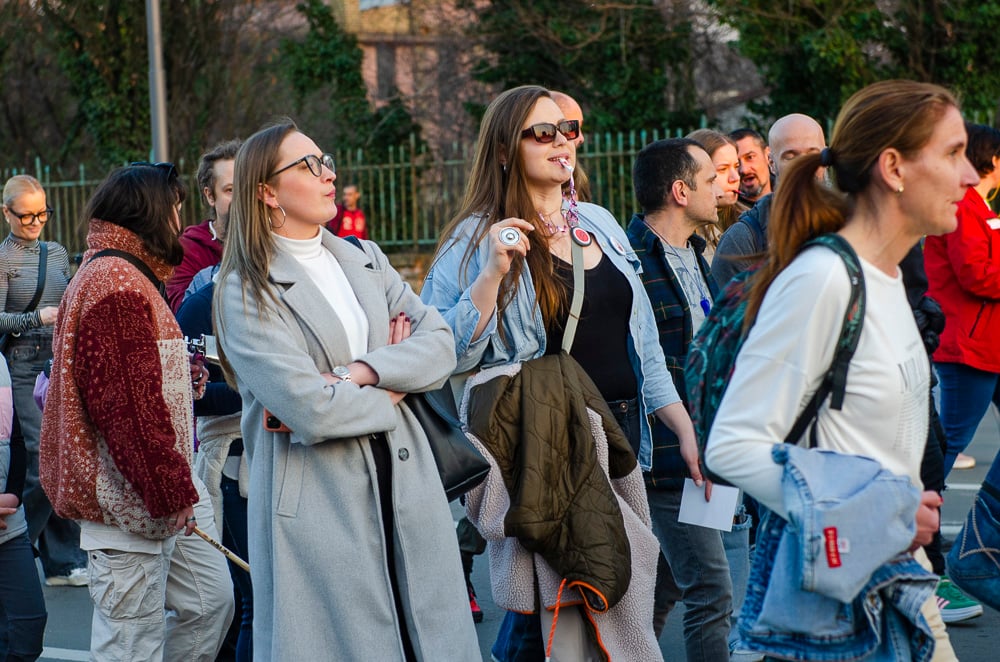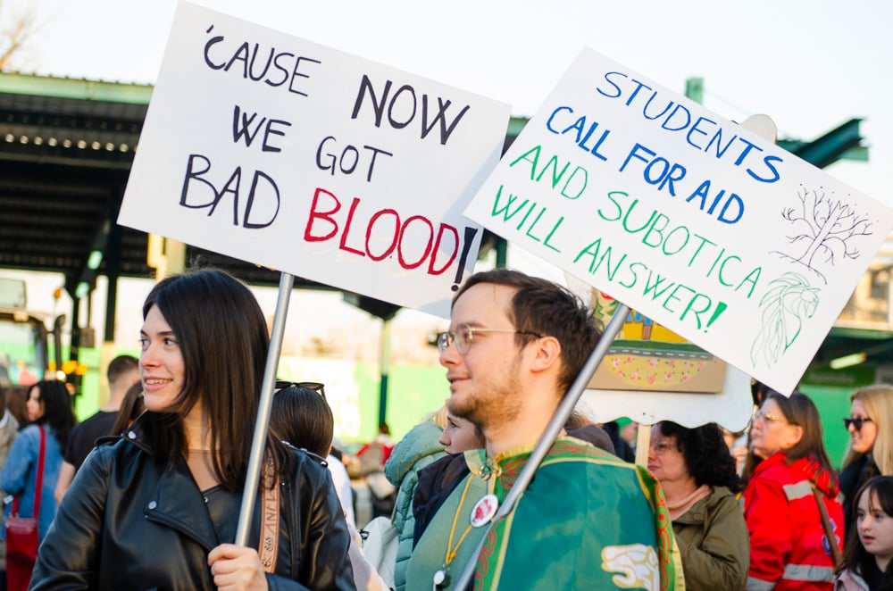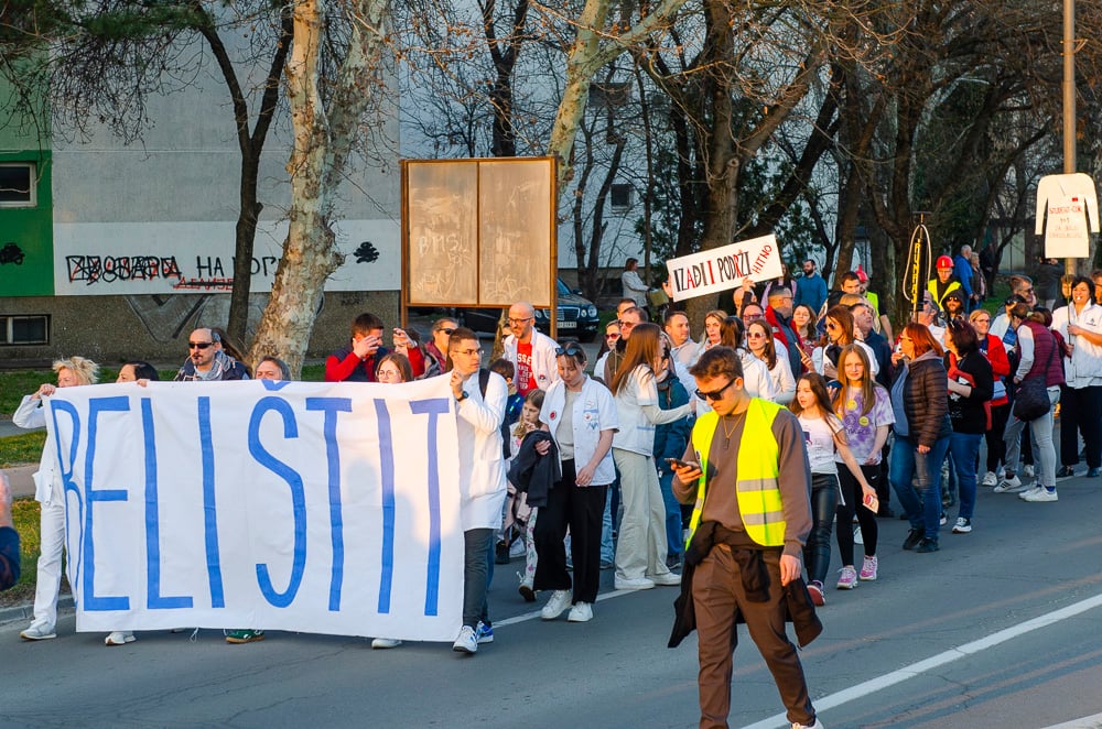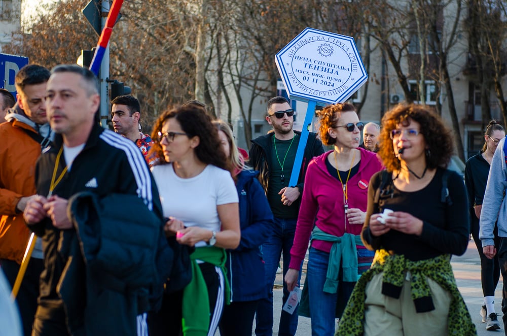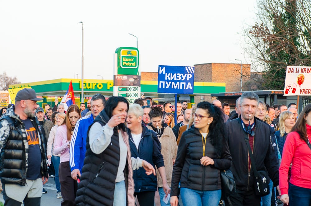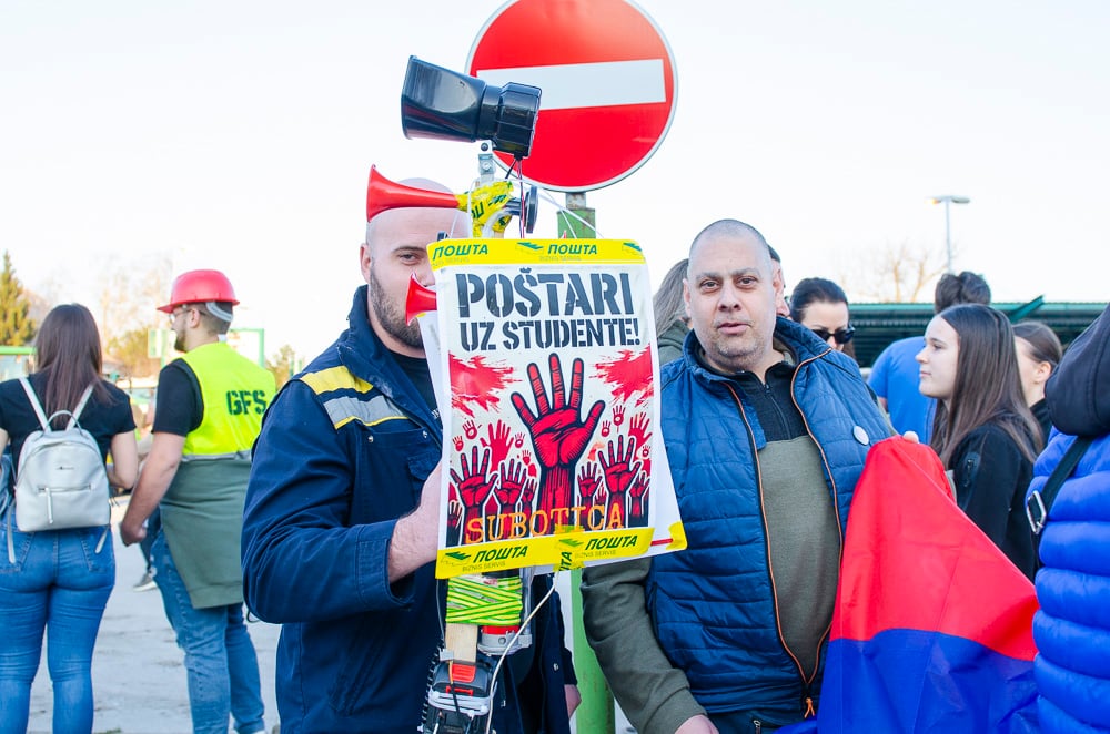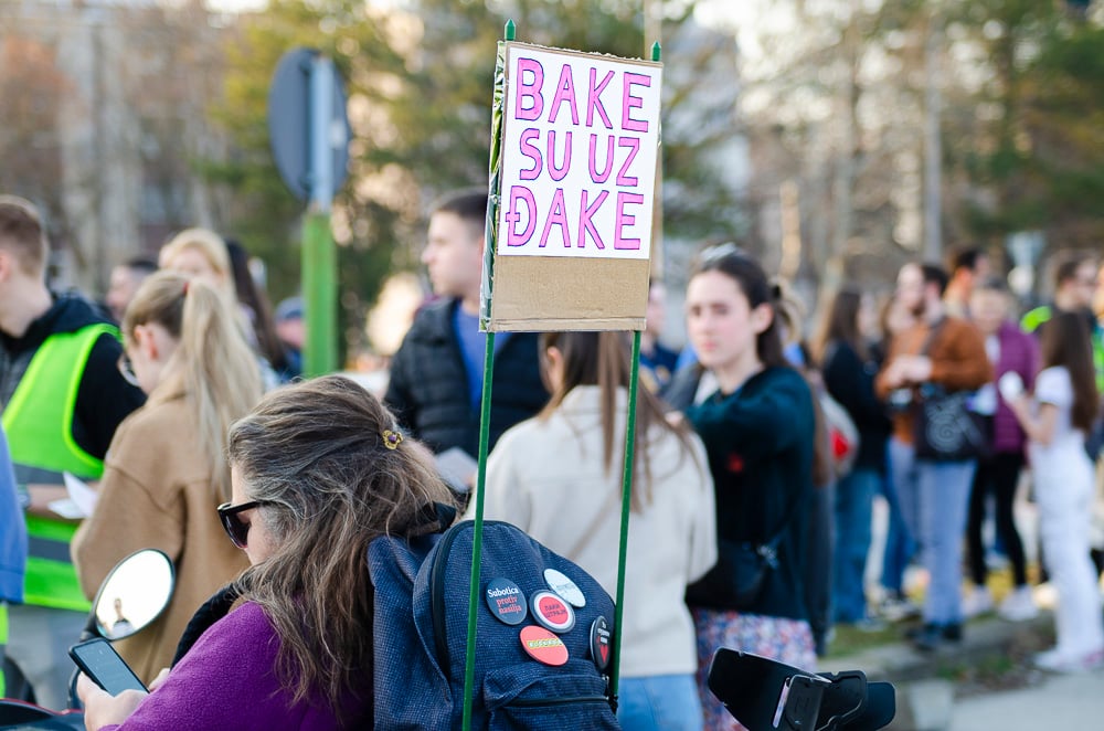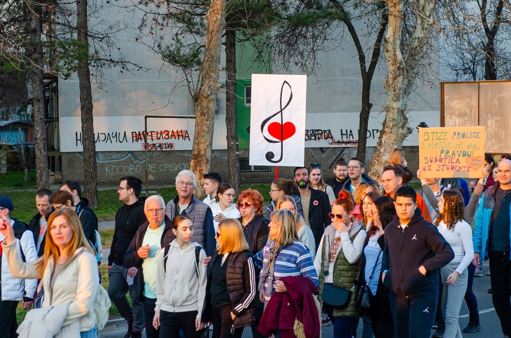 Nagy tapsot kaptak azok a fiatalok, akik március 8-án, szombaton gyalog indultak Belgrádba és vasárnap este a szabadkai tüntetéssel egyidőben Szenttamásra értek. Az egyetemi hallgató felszólította a szabadkaiakat, hogy március 15-én csatlakozzanak hozzájuk a belgrádi tüntetésen.