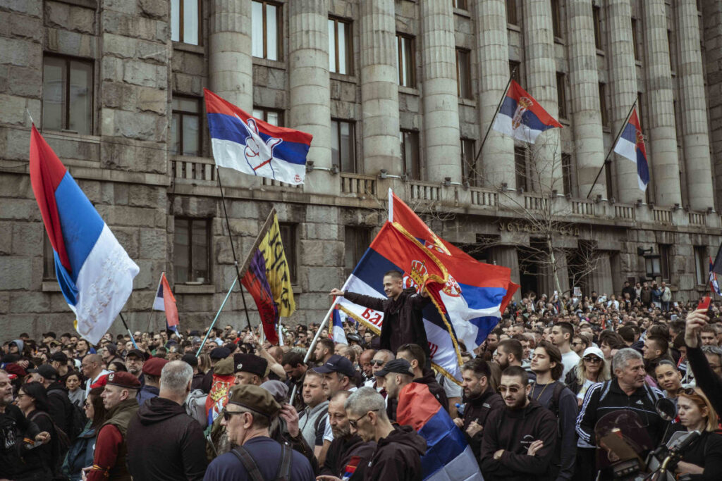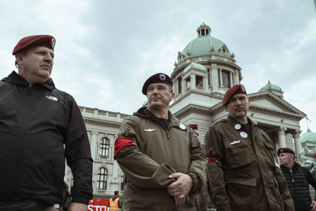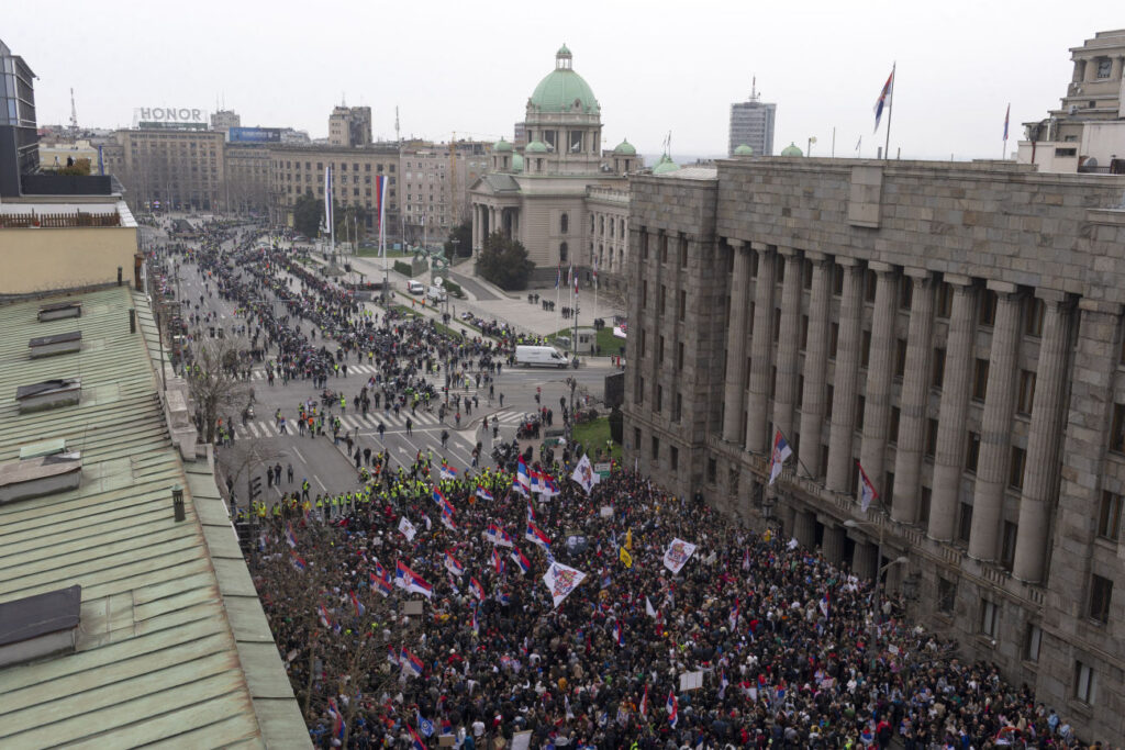 A szerb parlament épülete előtt jelenleg az egyetemi hallgatók, a veteránok és a rendfenntartók, ügyeletes egyetemisták vannak, az oda vezető utakat lezárták.