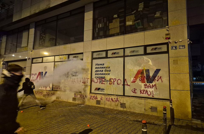 A tiltakozás során tojásokkal dobálták meg a Szerb Haladó Párt irodáját a Stražilovs utcában, és graffitiket is festettek rá.