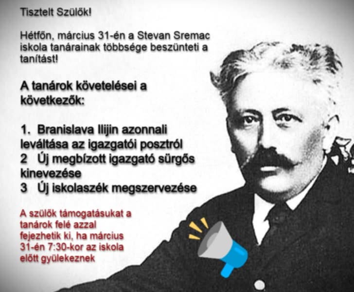 A zentai Stevan Sremac Általános Iskola tanárainak többsége úgy határozott, hogy hétfőn nem tartja meg az óráit. Erre az elhatározásra azután jutottak, hogy kiderült, az iskolaszék, amelynek mandátuma március 12-én lejárt, úgy döntött, hogy elfogadja Branislava Ilijin igazgatónak azt a beadványát, amelyben az áll, hogy az oktatási intézmény vezetője visszavonja 2024. november 8-ai visszavonhatatlan lemondását.