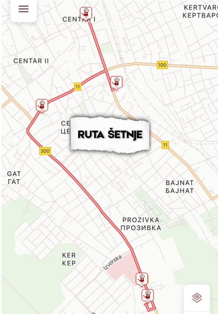 Innen indul majd a tüntető menet először a fizikai blokád alatt lévő Egészségügyi Középiskolához, majd a Vegyészeti Középiskolához, onnan pedig a Műszaki Középiskolához mennek. Minden iskola előtt beszéd lesz. A menet ezt követően a Közgazdasági Középiskola elé vonul, ahol szintén beszédet tartanak, zajt keltenek, majd megtartják a 16 perces csendet. Erre az időre lezárják a Đuro Đaković és a Zmaj Jovin utcák kereszteződését.