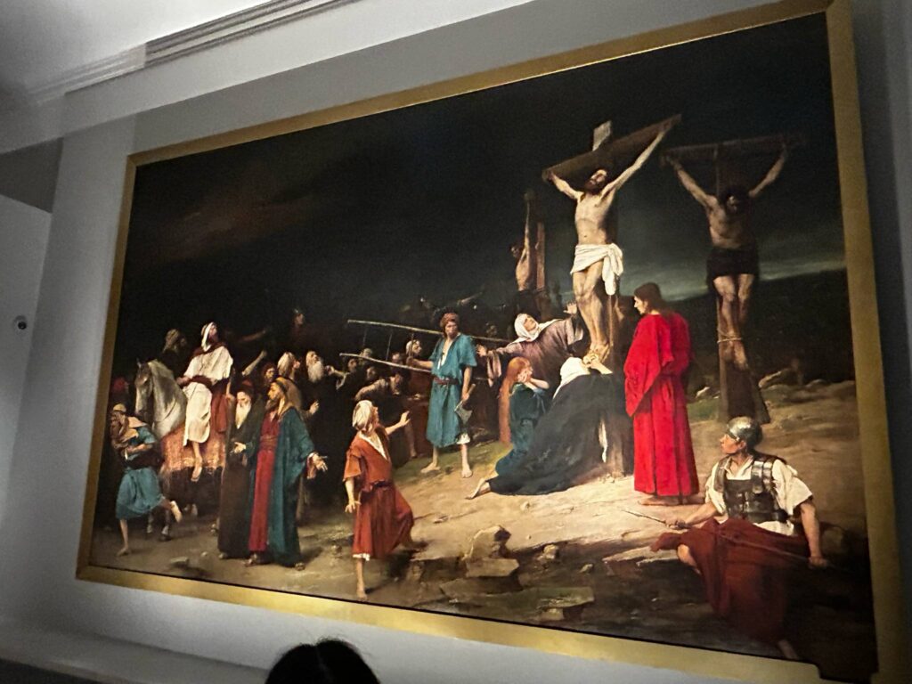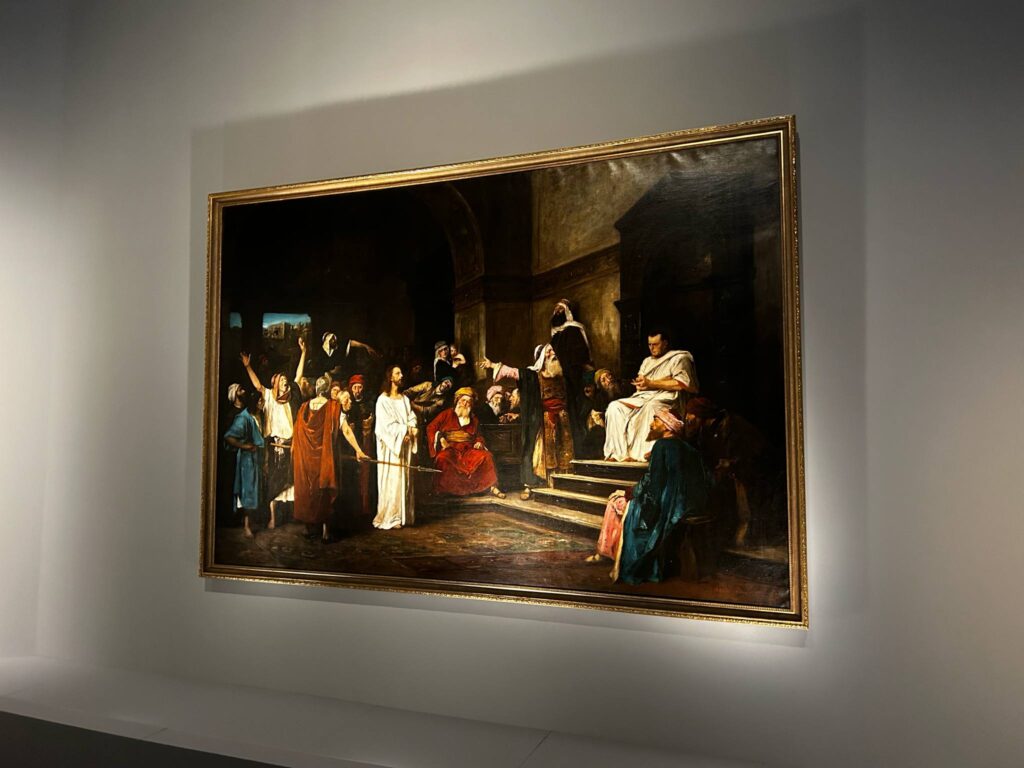 A Munkácsy. Egy világsiker története címet viselő tárlat kurátora Krasznai Réka volt, aki az összeállítás szervező elvévé Munkácsy Mihály (1844–1900) életpályájának a világhírnév felé tartó felfutását avatta; a Zálogház című festményének düsseldorfi sikerétől az 1870-es párizsi Szalon hozta elismerésen át a grandiózus főművekig: a Krisztus-trilógiáig. Ezekből eredeti formájában az 1884-ben elkészült Golgota című kolosszálkép tekinthető meg a tárlaton. A tér adottságaiból következően nemcsak esztétikai és művészi értelemben, de látvány szempontjából is felejthetetlen élményt jelent. Lenyűgöző hatást tesz a befogadóra e környezetben az Országházában kiállított, de a tárlat rendelkezésére bocsátott Honfoglalás látványa is.