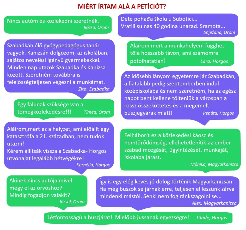 A petícióban megfogalmazott követelések magukba foglalják a polgárok a tömegközlekedéssel kapcsolatos elemi igényeit: az önkormányzat mérje fel az érintettek valós helyközi közlekedési szükségleteit és közfeladatként szervezze meg a közvetlen, megfelelő gyakoriságú és megfizethető buszjáratokat Magyarkanizsa község települései és Szabadka között.