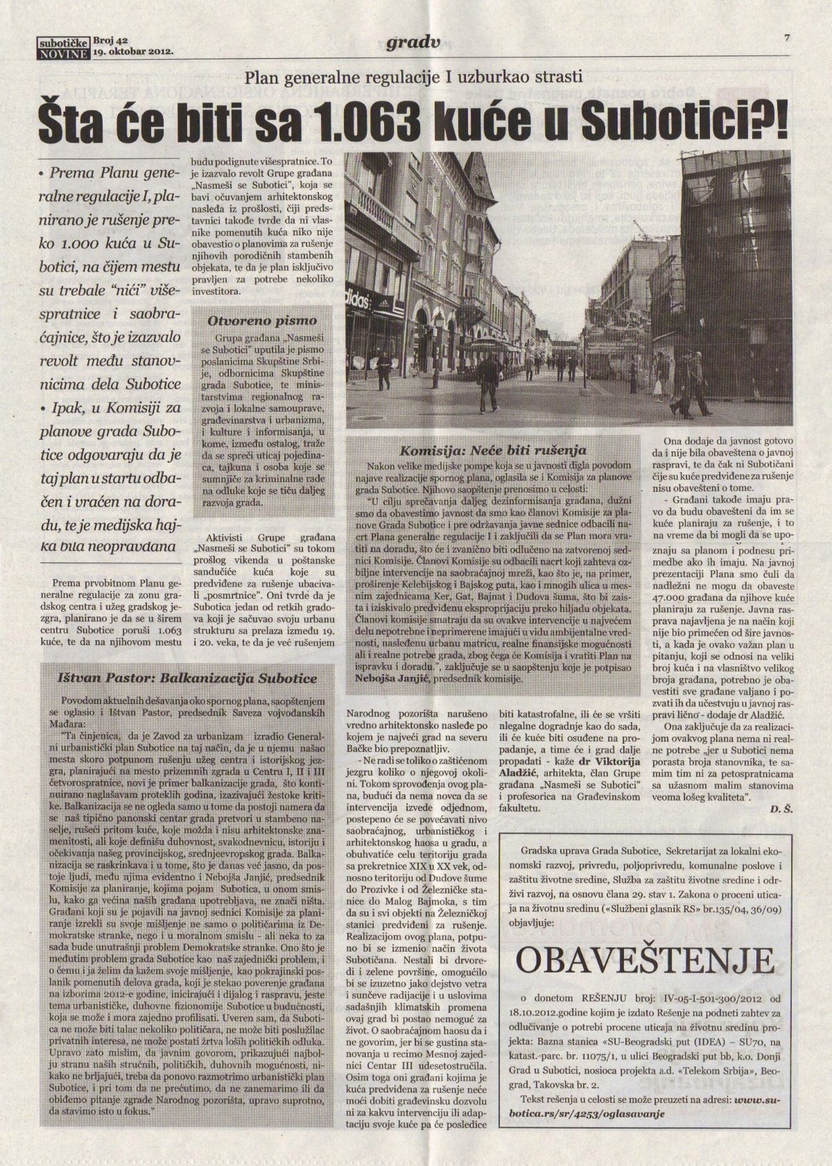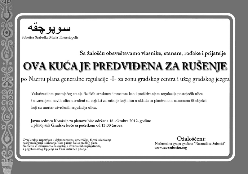 Ez a terv erős közfelháborodást váltott ki, különösen azután, hogy a Mosolyogj Szabadkára! (Nasmeši se Subotici) nevű informális polgári csoport, Viktorija Aladžić építész vezetésével figyelemfelkeltő kampányt indított. A nyilvános vita előtt az érintett házakra olyan értesítéseket ragasztottak ki, amelyek küllemükben gyászjelentésekre emlékeztettek.