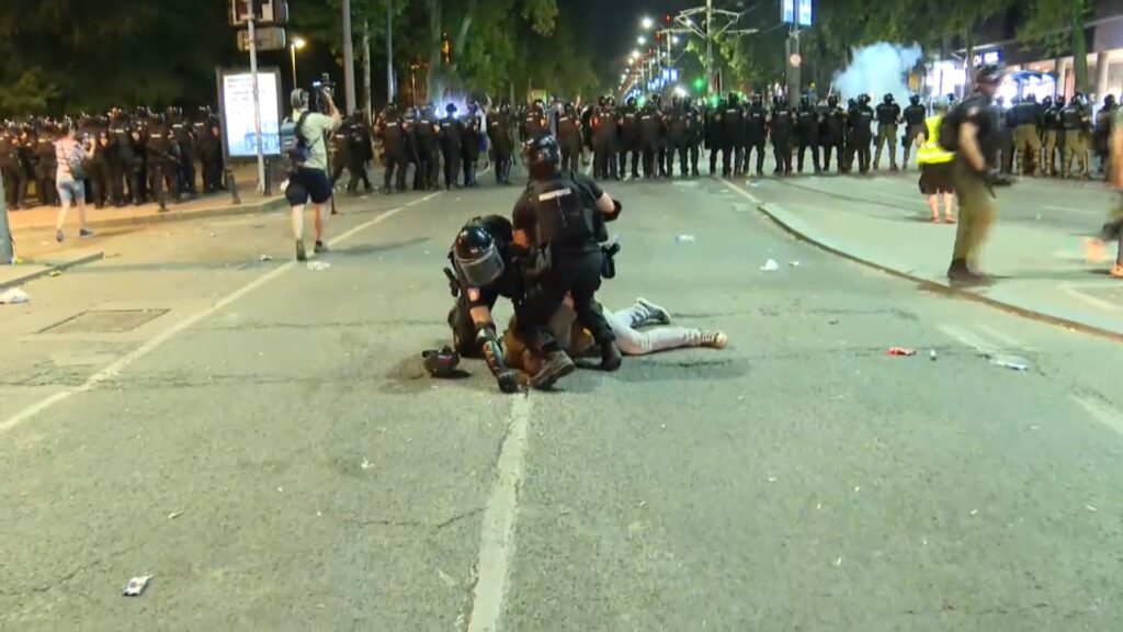 A rendőrség megkezdte a tömeg kiszorítását a Miloš kenéz utcában. A rendőröket különféle tárgyakkal dobálták meg, a tömeg pedig „Árulás!” jelszavakat skandált.
