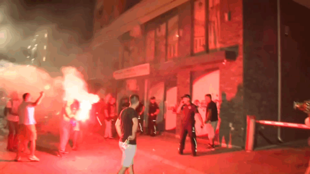 Az épület első emeletéről pedig férfiak, akik pólójukkal rejtették el arcukat, tojásokat és üvegeket kezdtek dobálni az emberekre és vízzel locsolták őket. Egy polgár arról számolt be az N1-nek, hogy a haladópárti fiatalemberek köveket és éles tárgyakat is dobáltak rájuk. Erre reagálva néhány polgár betörte az SNS irodájának kirakatát, és egy pillanatban füst szállt fel, de az nem teljesen világos, hogy az hogyan keletkezett.