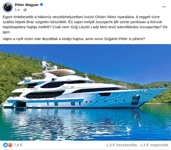 „Ugyan tegnap magyarokat rakétáztak Munkácson, de a leköszönő magyar miniszterelnök ma már jachtozik és az osztrigát francia pezsgővel öblíti le. Képmutatás, hazugság. A nem működő ország luxus maffiafőnöke. Vége van, elvtársak!” – üzente a Tisza Párt vezetője.