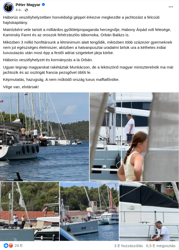 „Ugyan tegnap magyarokat rakétáztak Munkácson, de a leköszönő magyar miniszterelnök ma már jachtozik és az osztrigát francia pezsgővel öblíti le. Képmutatás, hazugság. A nem működő ország luxus maffiafőnöke. Vége van, elvtársak!” – üzente a Tisza Párt vezetője.