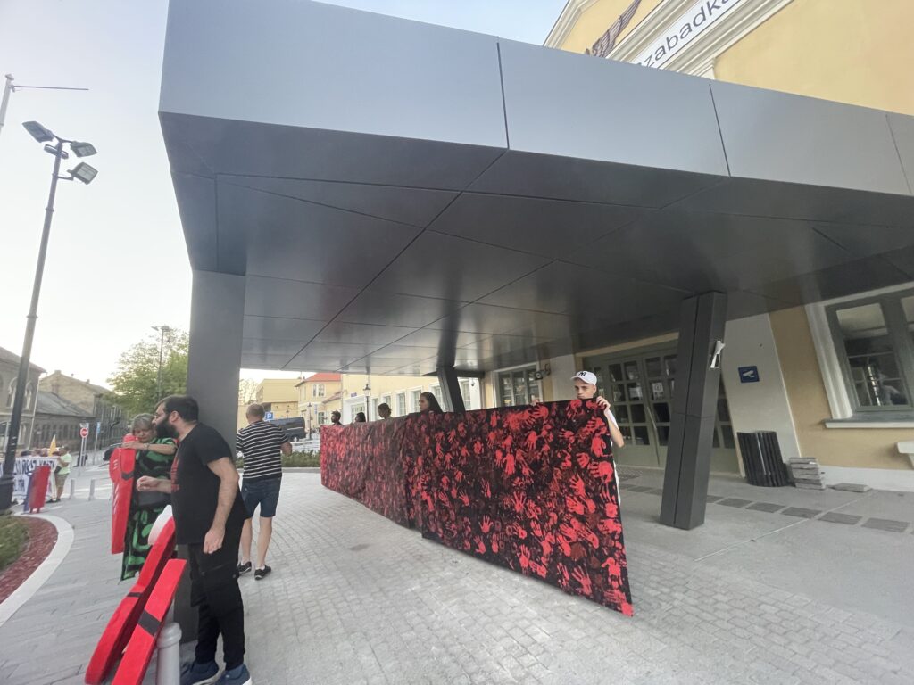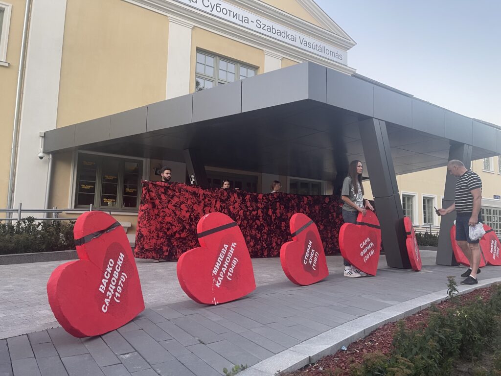 A szabadkai vasútállomás előtt hungarocellből készült, piros szíveket helyeztek ki a 16 áldozat nevével, az egyetemisták pedig az állomás elé újonnan épített előtető alatt álltak, egy fekete vásznat tartva, amelyen véres kezek voltak.