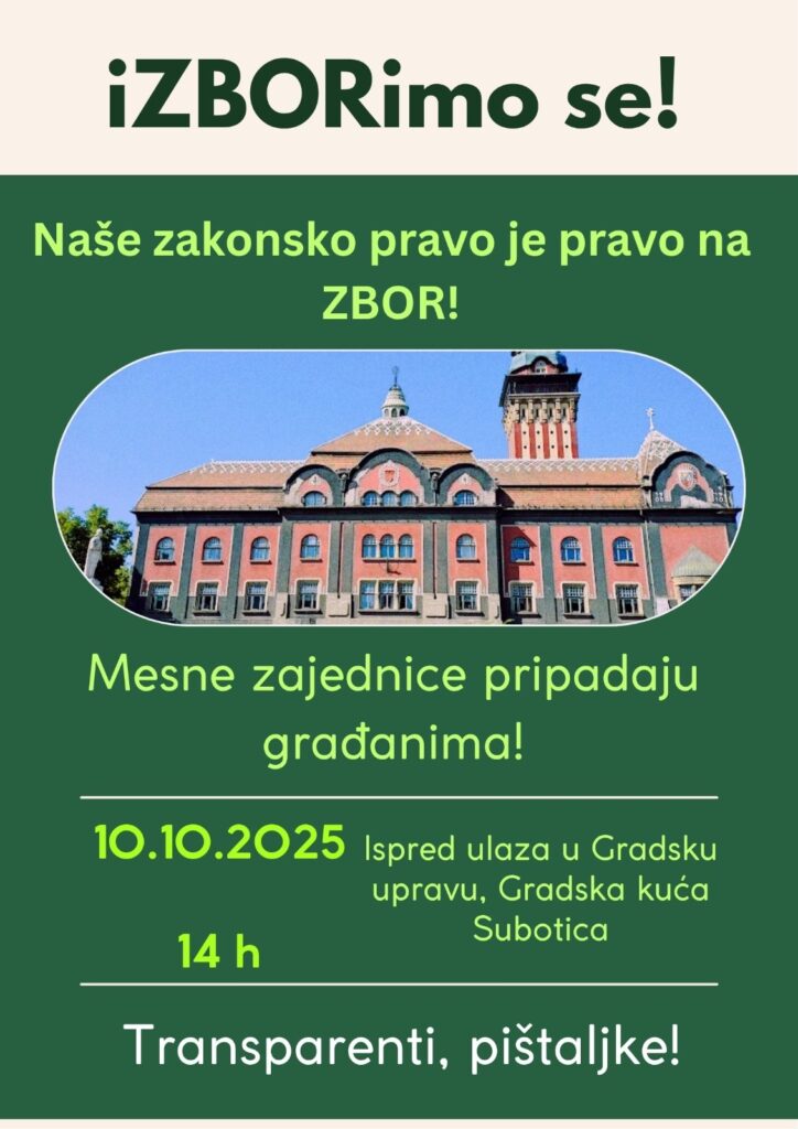 A Városháza bejárata elé mennek tüntetni pénteken a szabadkaiak, tiltakozásul, amiért a polgári gyűlések megtartásához nem használhatják a helyi közösségek termeit.