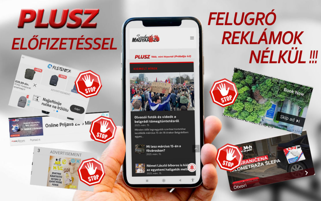 Segítsünk egymáson! Napi húsz dinárért (0,17 euró) legyél a Szabad Magyar Szó előfizetője, így megszabadulsz a felugró reklámoktól, elolvashatod a Plusz rovatban megjelenő cikkeket, és nem mellékesen ezzel is hozzájárulsz, hogy továbbra is a Szabad Magyar Szó legyen a legolvasottabb vajdasági magyar honlap és még több helyi témáról számoljunk be!