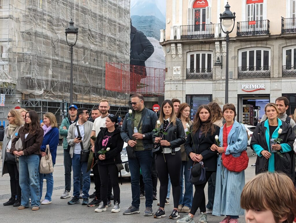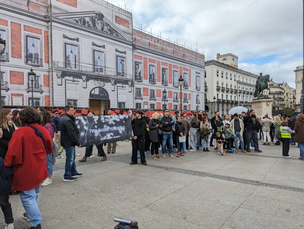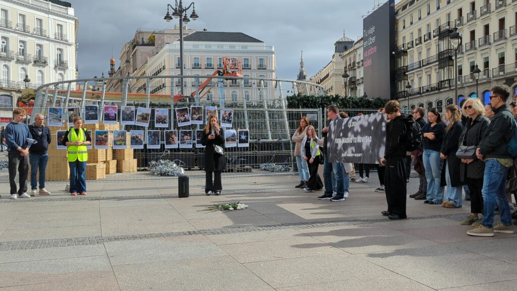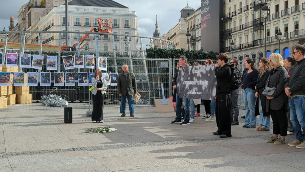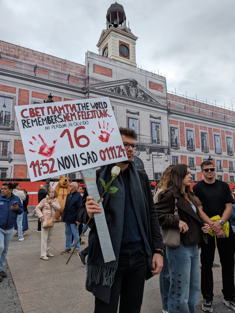 A madridi Puerta del Sol terén mintegy 150 ember gyűlt össze, köztük szerbek, spanyolok, amerikaiak és németek. Az esemény 16 perces néma csenddel kezdődött – minden elveszített életért. Ezután felolvasták a 16 áldozat nevét, majd a résztvevők egy-egy fehér rózsát helyeztek el a tér közepén.