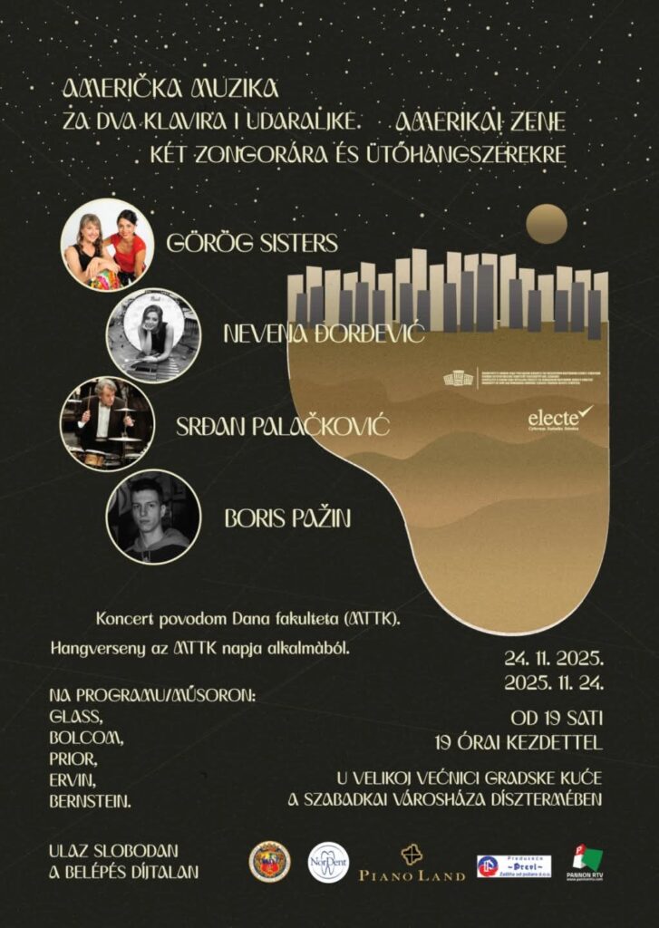 Amerikai zene két zongorára és ütőhangszerekre – ez az elnevezése annak a hangversenynek, amelyet a szabadkai Magyar Tannyelvű Tanítóképző Kar napja alkalmából tartanak jövő hétfőn, november 24-én az Electe Egyesület és az MTTK szervezésében.