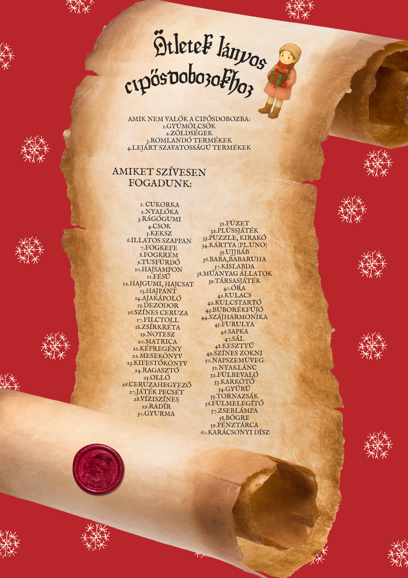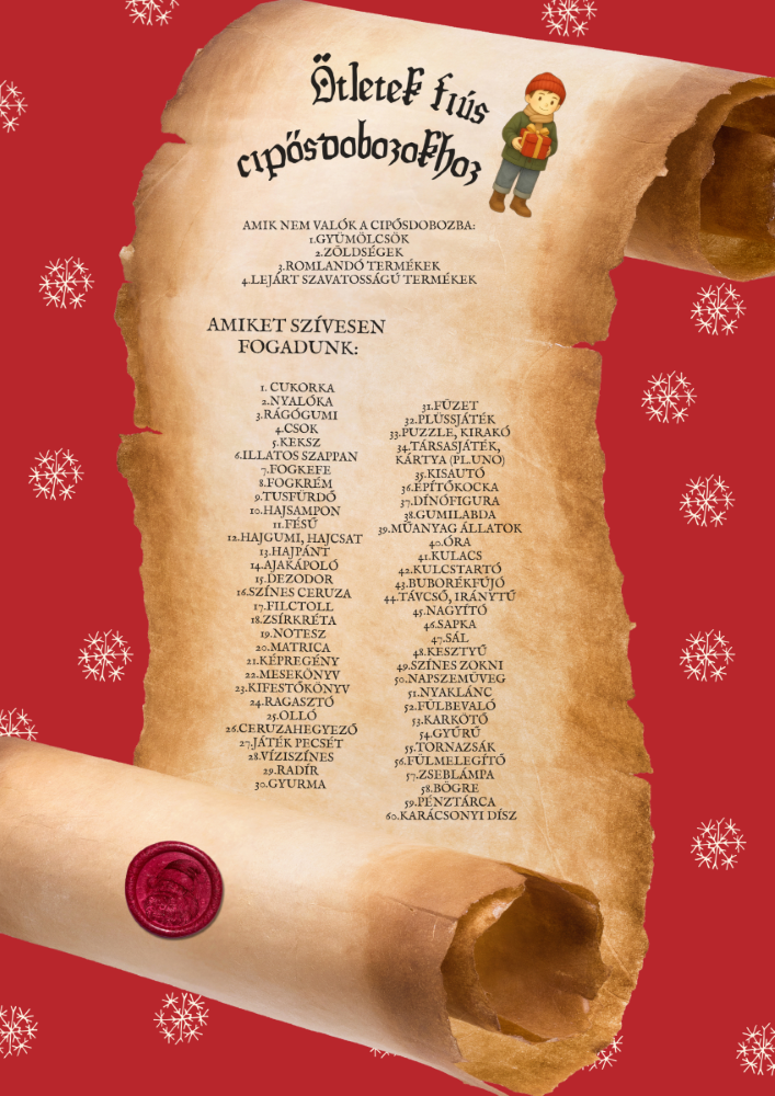 – a cipősdobozok alsó és felső részét külön-külön csomagolják be az adományozók, hiszen így ellenőrizhetik tartalmukat, és kiegészíthetik őket a hiányzó meglepetésekkel;