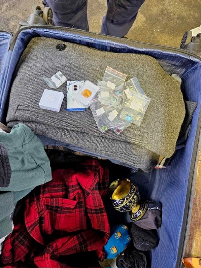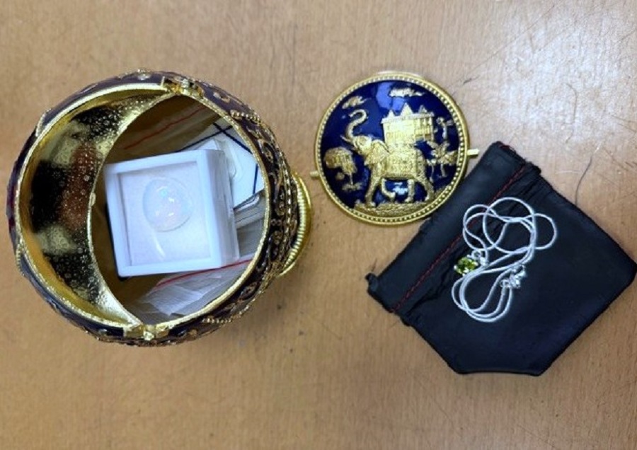 Noha az utas először azt állította, hogy nincs semmi bejelenteni valója, a poggyász részletes ellenőrzése során kiderült, hogy személyes tárgyai között egy keleti díszdoboz lapul, benne 13 darab féldrágakővel, többek között topázzal, ametiszttel, tanzanittal, spinellel, akvamarinnal, rodolittal, opállal és másokkal.