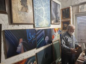 – Az nem, persze. De én konokul kitartottam amellett, hogy nem akarok továbbtanulni, nem akartam tovább iskolába járni. Ez persze visszaütött aztán a későbbiekben jó nagy pofonokkal. Olyannyira, hogy a hatvanas évek közepe táján néha már az öngyilkosság gondolata is motoszkált a fejemben. „Ezt tovább nem lehet bírni…” Talán önsajnálat lehetett ez, nem is tudom pontosan meghatározni, amiből azonban kisegített, hogy 1966-ban elhelyezkedhettem a mozinál. Még korábban azonban, 1957-ben adódott egy lehetőség, hogy tanuljak egy képnagyítónál, aki szó szerint kézzel nagyította fel festményszerűen a fényképeket. Ment a faluban, odaadták neki a fotókat, ő pedig kézzel átfestette azokat nagy méretben, színesben, ami azért is volt érdekes, mert a színes fényképezés akkoriban még nagyon ritka volt nálunk. Így találkozott egyszer apámmal, és megegyeztek ők ketten, hogy majd eljárok hozzá, ő pedig mindenre megtanít engem. Rövid ideig tényleg jártam is hozzá, menekült volt Magyarországról, könnyen lehet, hogy valami vaj is volt a füle mögött, mert úgy mondta, hogy rabságban tanult meg festeni. Egy bérelt pincehelyiségben élt, amivel kapcsolatban folyamatosan arra panaszkodott, hogy nedvesek a falak. Megsajnáltam, és odaadtam neki az összespórolt pénzem, hogy valamennyit besegítsek. Közben én szerbül alig tudtam. Hát mit tanultunk mi az iskolában Csurgón? Sto, prozor, ormar, meg mit tudom én, de egy épkézláb mondatot nem tudtunk összerakni. Már a palicsi iskolában történt, hogy kaptunk egy feladatot, hogy fordítsunk le rövid magyar mondatokat szerbre. Nem tudtam, hogy mondják a pirosat, de eszembe jutott, hogy az akvarellfestéken ott írja, hogy ultramarin. Aztán azon is jót röhögtek az osztálytársaim, amikor felolvastam, hogy trešnja je cinober. Nagyjából ilyen nyelvi szinten álltam a szerbbel, amikor ez a képnagyító becsapott, eltűnt az összespórolt pénzemmel. Bementem hozzá, de csak a felesége volt otthon, aki horvát volt, nem tudtam vele beszélni. Megkértem ott valakit az udvarban, hogy segítsen, tolmácsoljon nekem. Akkor derült ki, hogy a képnagyító otthagyta a feleségét, elment egy másik nővel. Aztán én még hetekig jártam be oda, mert nem tudtam, hogy mit is csináljak. Hiszen elkezdődött számomra addigra már egy szép kis életmód, hogy járok rajzolgatni, festegetni, és mindennek most hirtelen vége lett… És aztán most mi lesz?! Egy rokonon keresztül összehoztak Gustav Matkovićtyal, aki ugyan nem fejezte be az akadémiát, viszont nagyon jó festő volt Szabadkán. Hozzá jártam egy ideig, de ez sem tartott sokáig. Egy napon ugyanis azt mondta, hogy most már nem ér rá tanítgatni engem, de ha lesznek munkáim, azokat hozzam el hozzá, szívesen elbeszélget velem róluk. Ezután nagyon belendültem, úgyhogy 1960-ban az ő rábeszélésére rászántam magam, hogy egy önálló kiállításon mutatkozzak be a szabadkai könyvtár olvasótermében. Guszti még készített nekem kézzel írt plakátokat is. Nagyon jó ember volt, segítőkész, de utána mind kevesebbet tudtam hozzá járni. Hamarosan pedig berukkoltam, 1961-ben, akkor ismerkedtem meg Torok Sándorral, ő is Banja Lukába ment, együtt katonáskodtunk azzal a különbséggel, hogy ő a főiskola miatt csak tizennyolc hónapot szolgált, én pedig huszonhármat. De ebből így is egy, a Sanyi haláláig tartó barátság született, amelyben nagyon sok mindent csináltunk együtt.