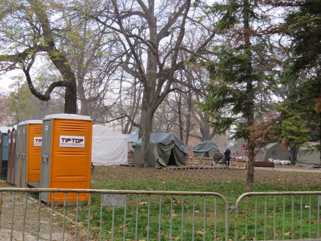 A tábor helyén az év elején lila csomagolású svájci csokoládéra emlékeztető bódékban, étel és ital várta a látogatókat, miközben szerb hazafias dalok szóltak. Sok minden ingyen volt, például a gyros is, valamint a pattogatott kukorica, az N1 tudósításából pedig az derülhetett ki, hogy az egész rendezvényt a Belgrade Waterfront vállalat, vagyis Belgrád víziváros szervezei.