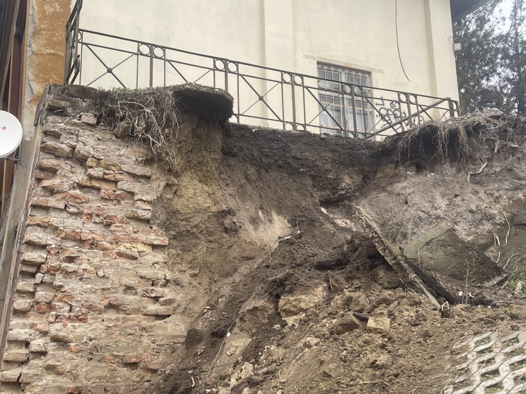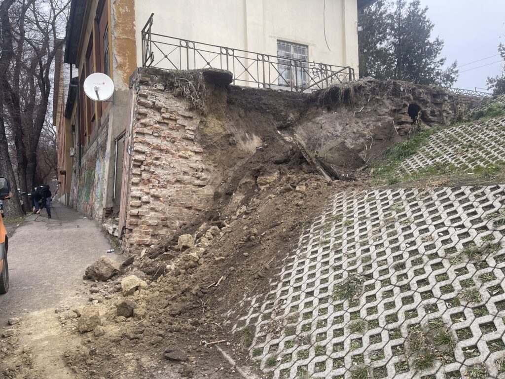 A szabadkai vasútállomásnál, a város központjában lévő aluljárónál leomlott a régi, meghagyott épület tartófala és sok föld omlott a járdára.