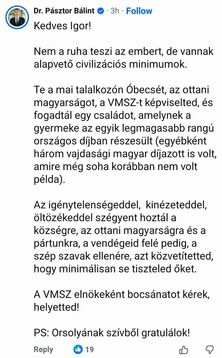 A kommentelők között volt, aki védelmébe vette Kiss Igort, és a következőket írta Pásztor Bálintnak: