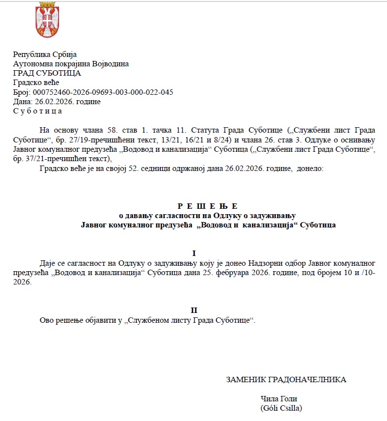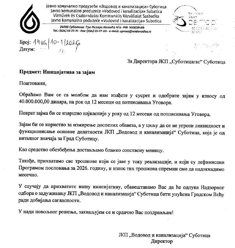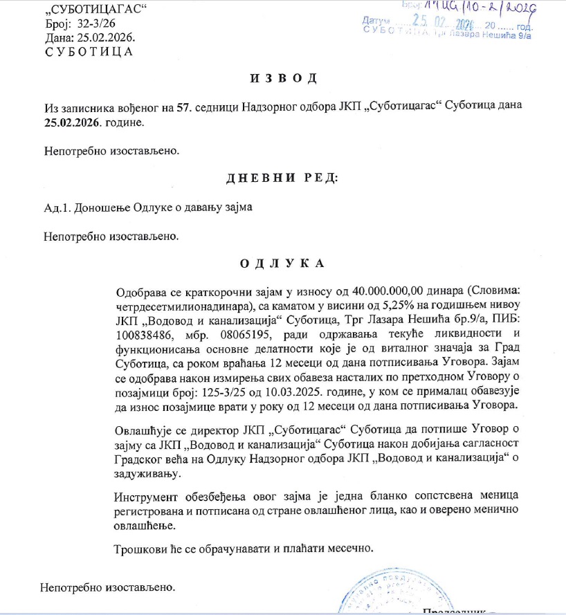 A Szabadkai Gázművek február 25-én hozott döntést arról, hogy 40 millió dináros kölcsönt hagy jóvá, amit a Vízműveknek a szerződés értelmében 12 hónapon belül vissza is kell fizetnie, 5,25 százalékos éves kamat mellett. A Szabadkai Gázművek döntésében szerepel, hogy a Vízművek a kölcsönt „folyó kiadásokra és az alaptevékenység zavartalan működésére kapja, amely létfontosságú a szabadkaiak számára”.