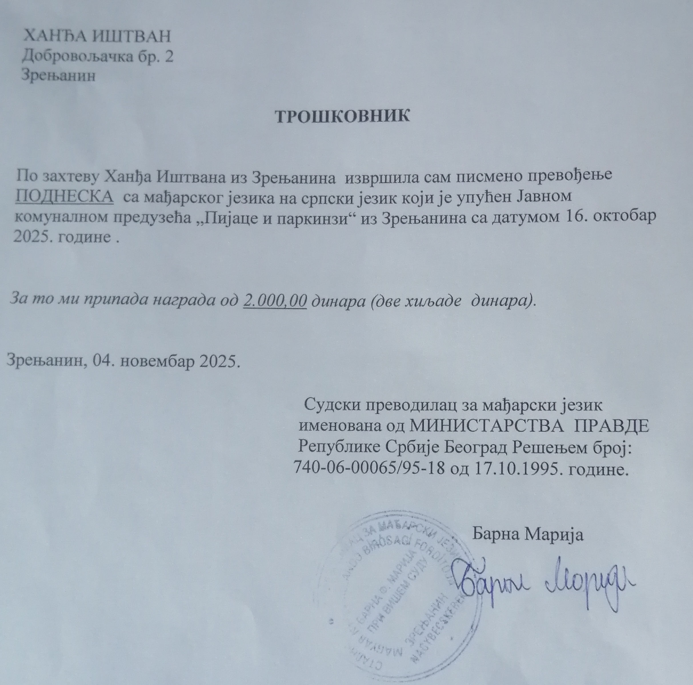 Hangya ezért egy hivatalos fordítót bízott meg beadványa szerb nyelvre történő lefordításával, aki 2.000 dinárért el is végezte ezt a szolgáltatást. A lefordított beadványt és a számlát továbbította a közvállalatnak, és felszólította őket, hogy térítsék meg a költségeit.