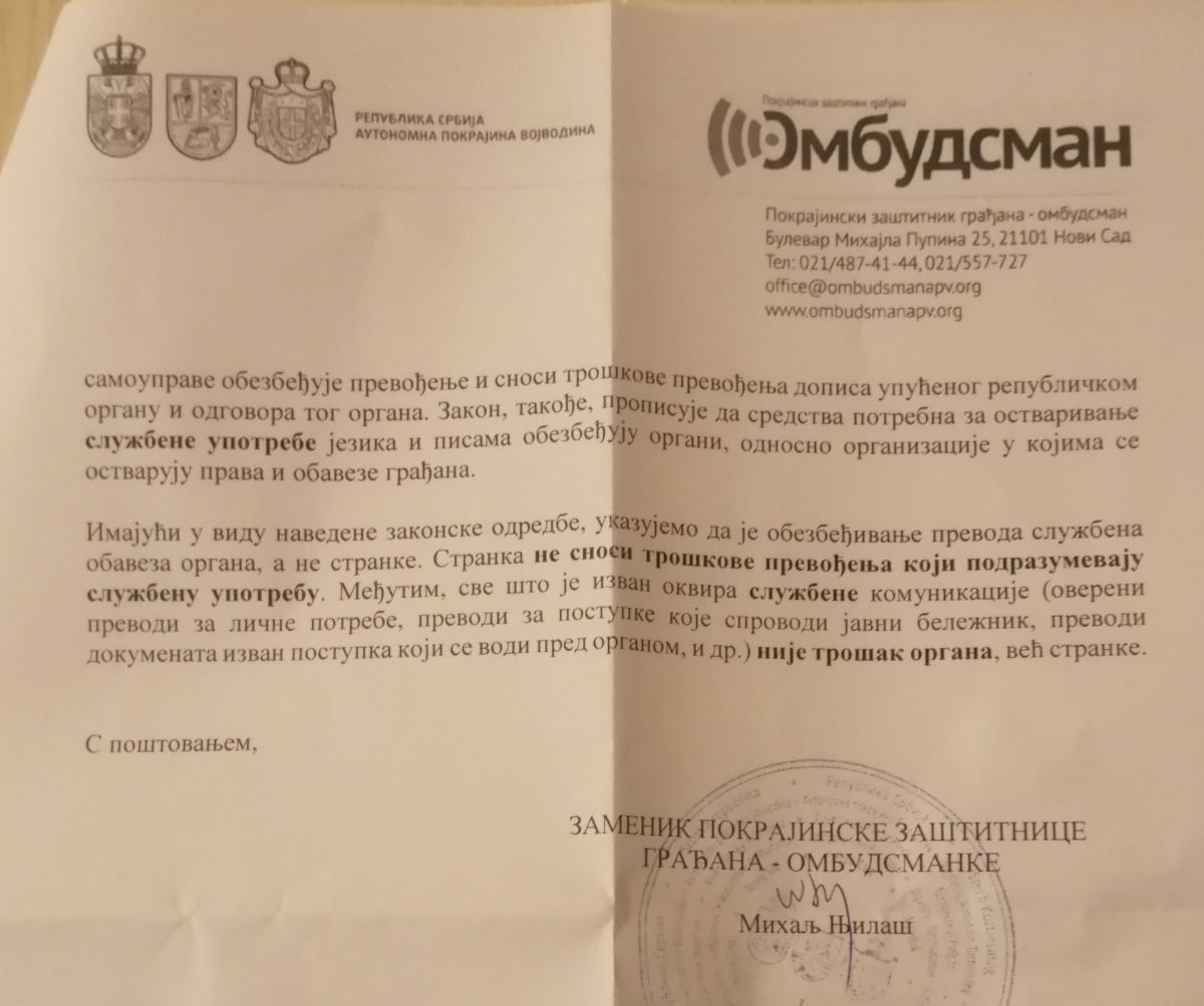 Hangya ebbe nem nyugodott bele, ezért Vajdaság Autonóm Tartomány Tartományi Polgári Jogvédőjéhez (ombudsmanjához) fordult. December 10-én az ombudsman nevében annak helyettese, Nyilas Mihály válaszolt, aki a vonatkozó törvények részletes ismertetése után azt írta: „a hivatalos eljárás keretein belül keletkező fordítási költségeket nem az ügyfél viseli”.