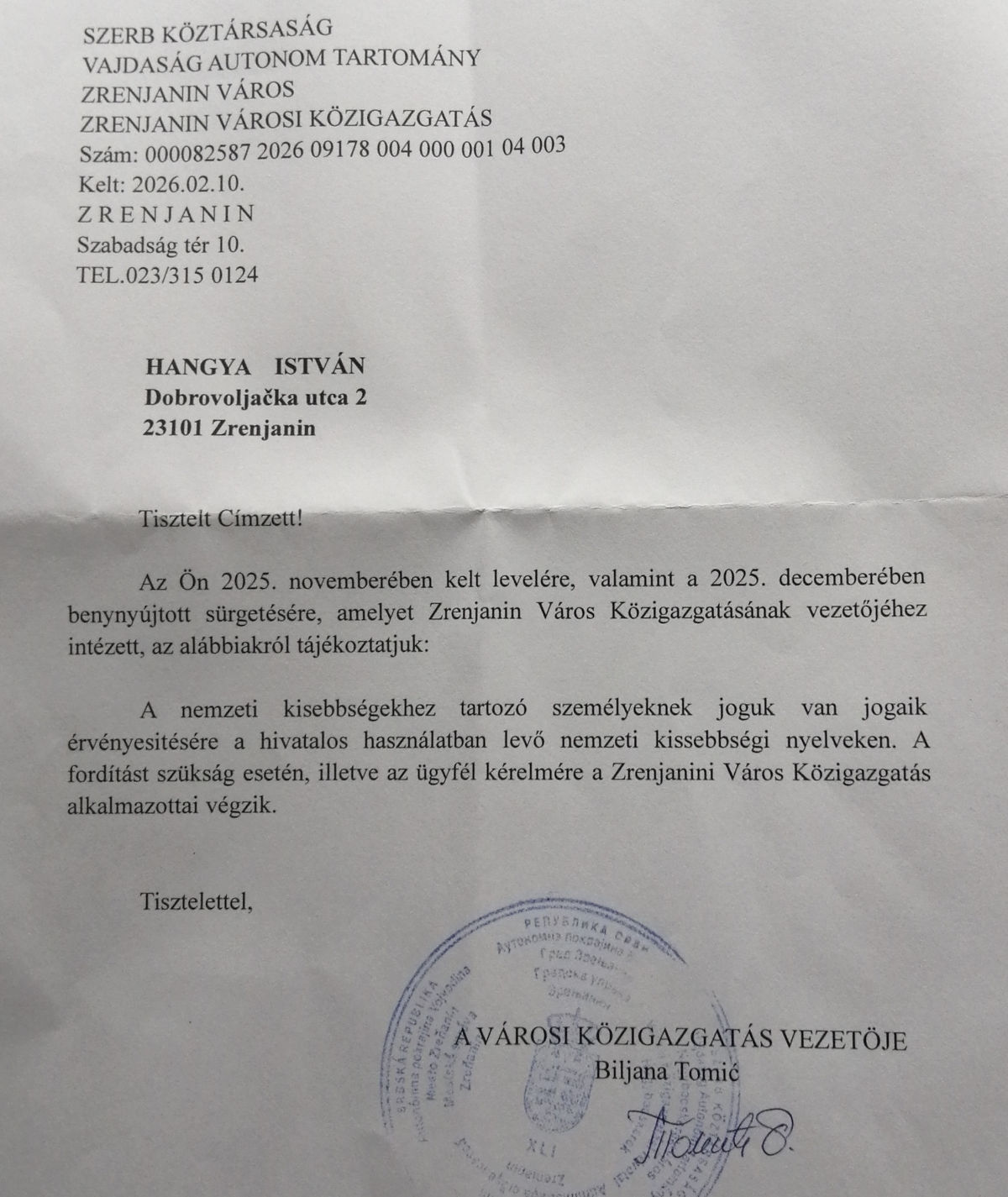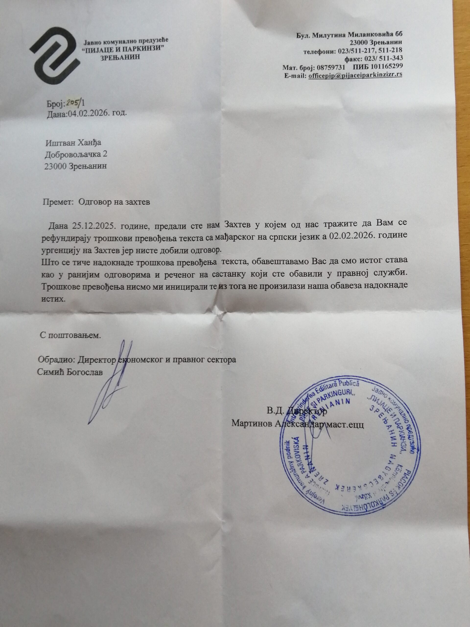 Hangya István 2025. október 16-án fordult egy (magyar nyelvű) beadvánnyal a helyi Piacok és Parkolók Kommunális Közvállalathoz (szabad fordítás, szerbül Javno Komunalno Preduzeće Pijace i Parkinzi, a vállalatnak magyar nyelvű honlapja nincs). A történet itt kezdődik.