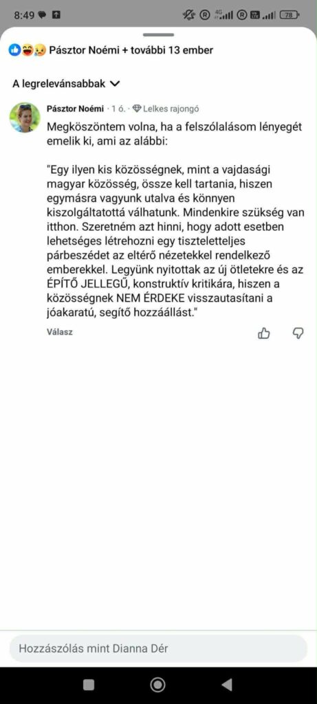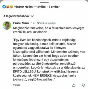 egymásra vagyunk utalva és könnyen kiszolgáltatottá válhatunk. Mindenkire szükség van itthon. Szeretném azt hinni, hogy adott esetben lehetséges létrehozni egy tiszteletteljes párbeszédet az eltérő nézetekkel rendelkező emberekkel. Legyünk nyitottak az új ötletekre és az ÉPÍTŐ JELLEGŰ, konstruktív kritikára, hiszen a közösségnek NEM ÉRDEKE visszautasítani a jóakaratú, segítő hozzáállást.”
